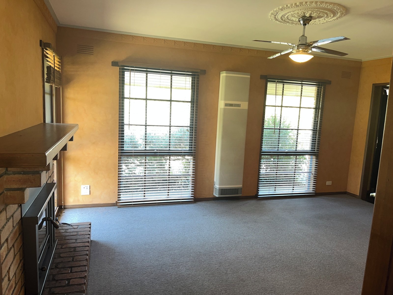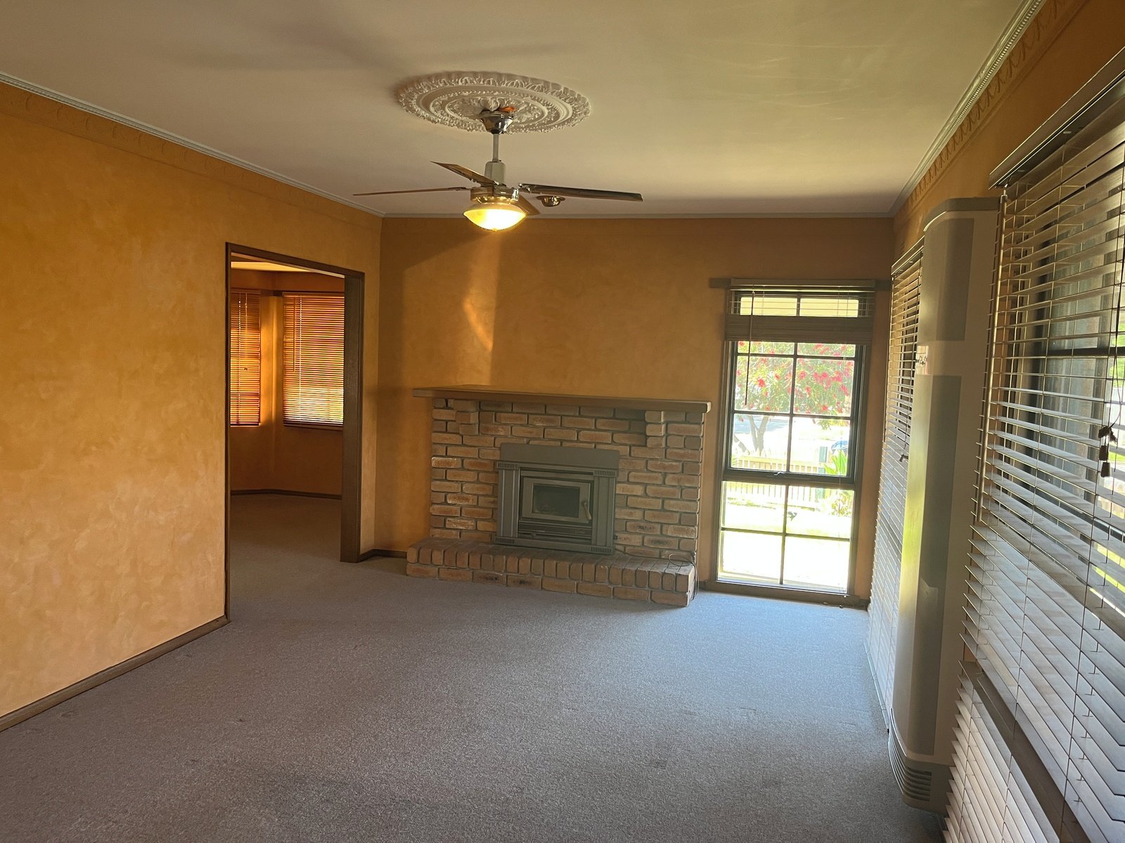 The property offers three generously sized bedrooms, all with built-in robes, along with a spacious living area featuring a gas wall furnace and a log fireplace. A formal dining area and second living space provide flexibility for families or those working from home.