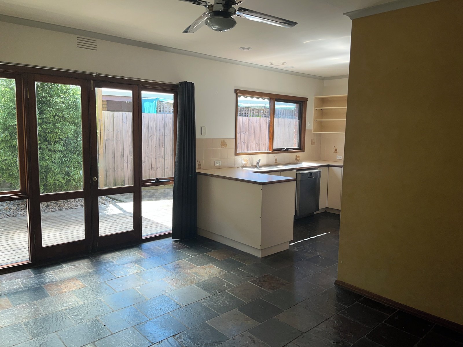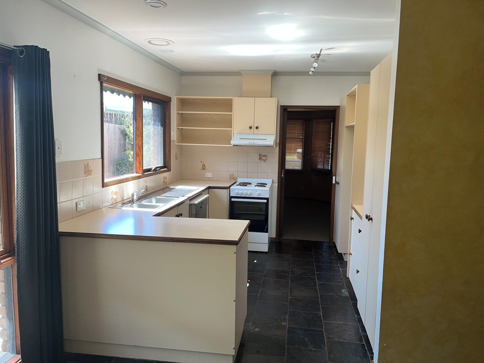 The kitchen is well appointed with electric cooking, a dishwasher, and ample cupboard space. Sliding doors offer easy access to the outdoor entertaining area and rear yard, which includes a single garage and storage shed.