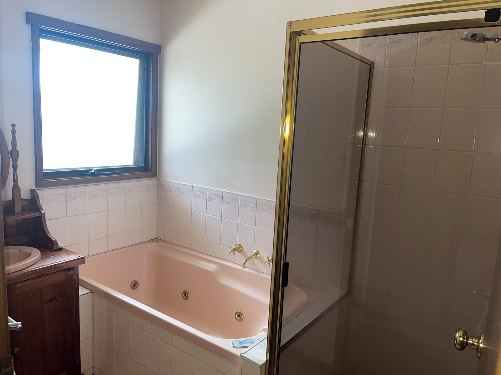 Additional features include a central bathroom with shower, bath (spa not in use), vanity, and a separate toilet.