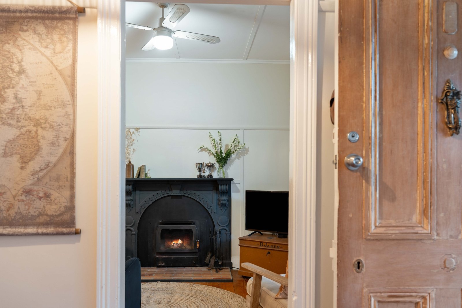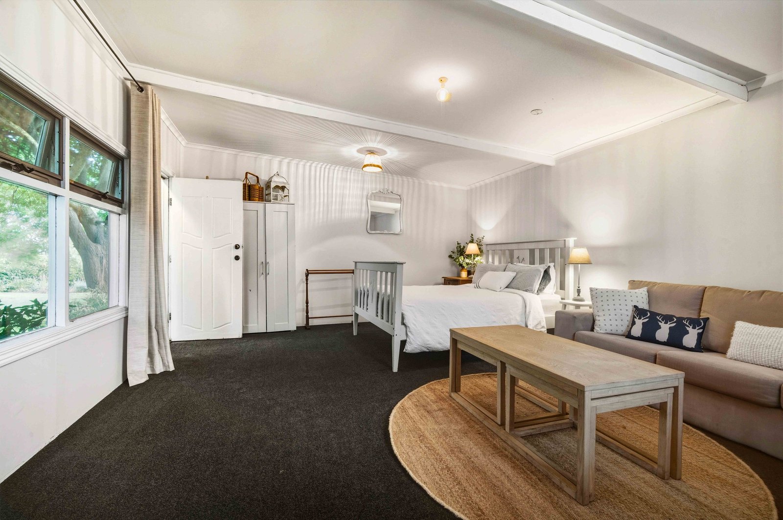The main cottage is warm and welcoming, featuring polished hardwood floors, plantation shutters and an open-plan living zone centred around the crackling wood fire, a place made for slow mornings and cosy evenings. The kitchen, dining and living areas flow effortlessly, creating a space that feels both intimate and connected to the outdoors.