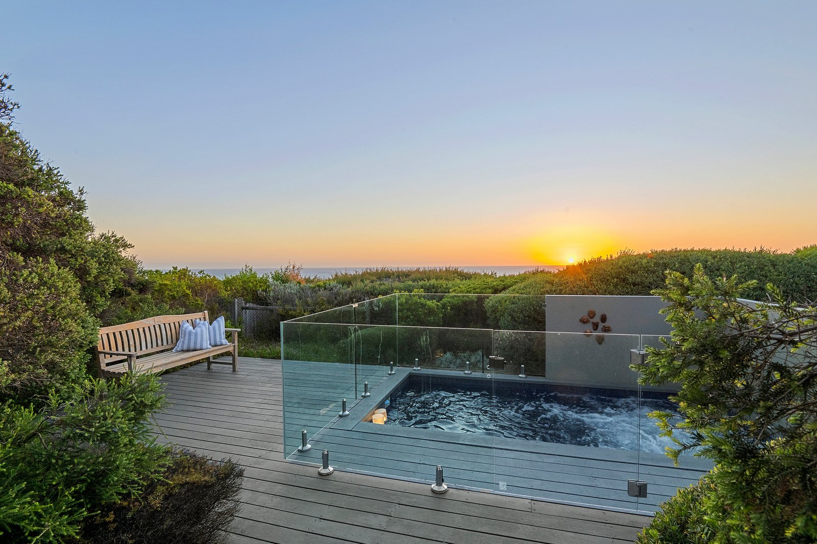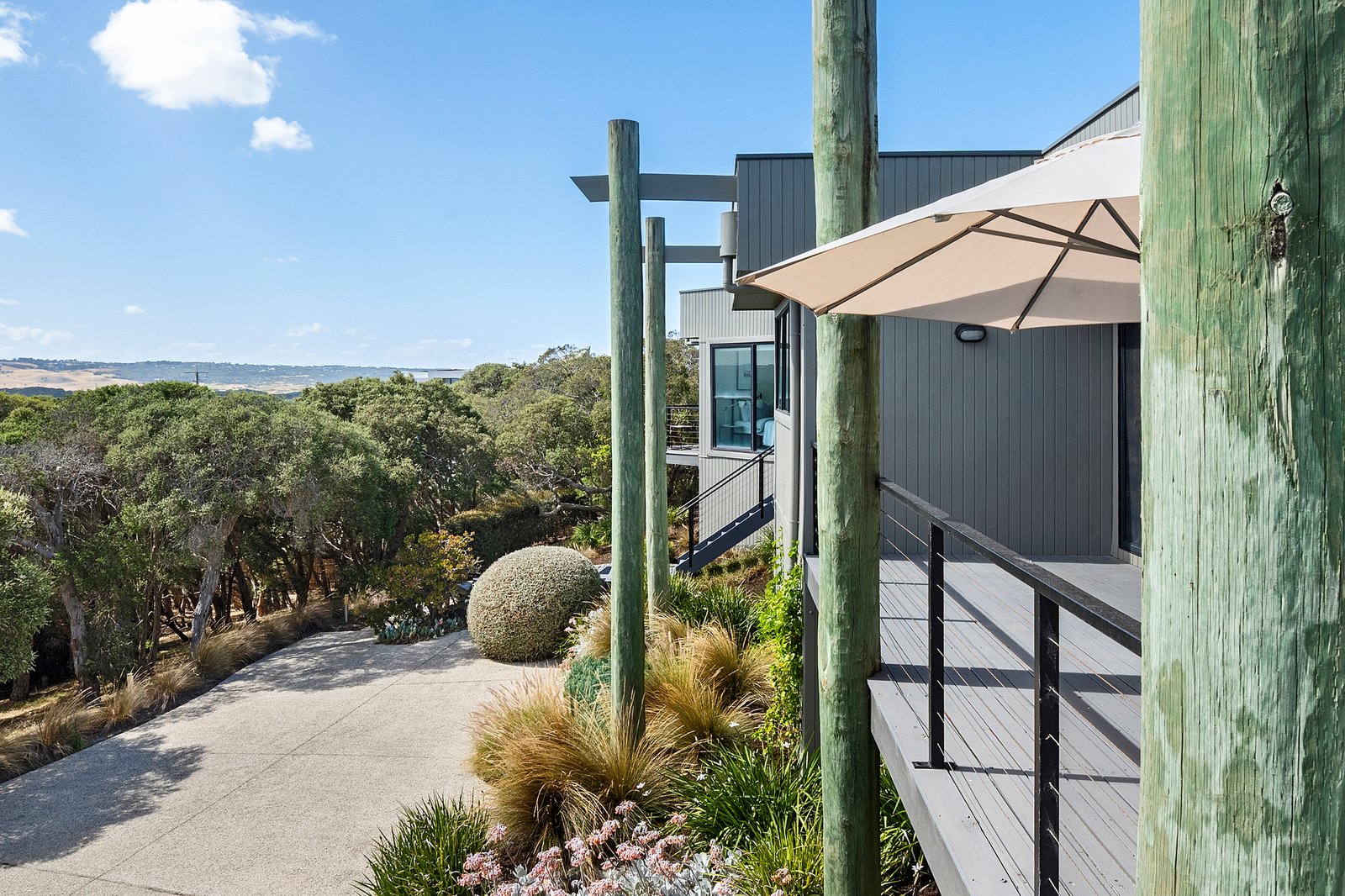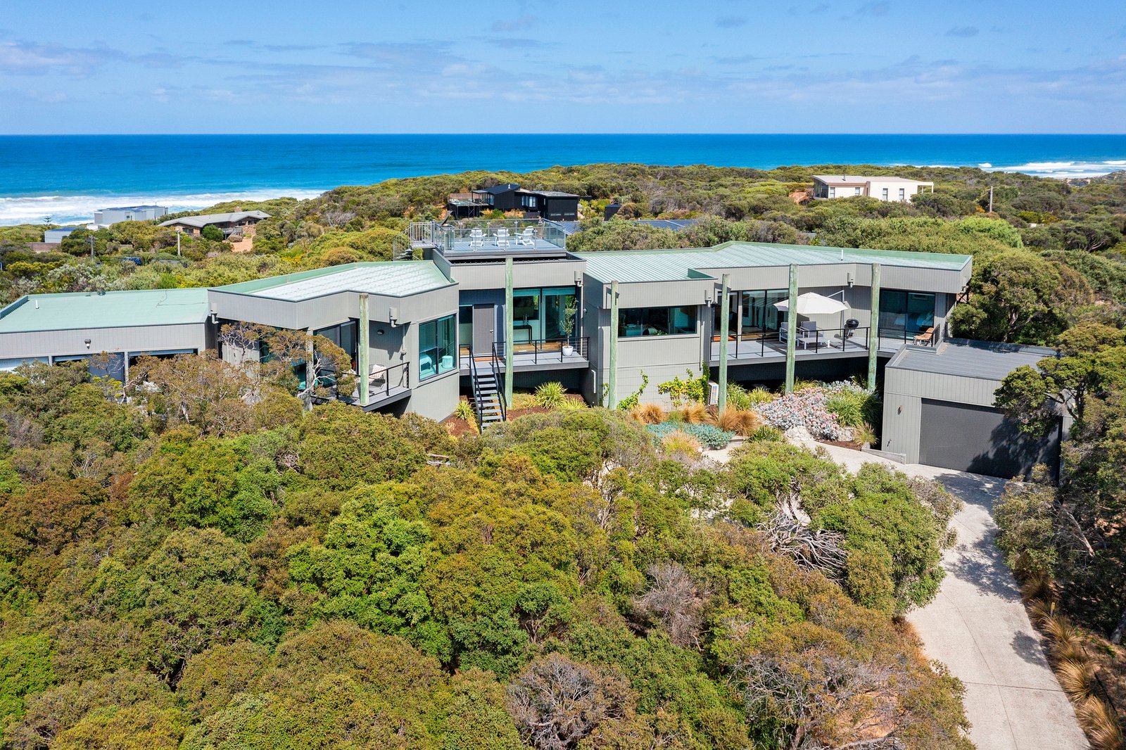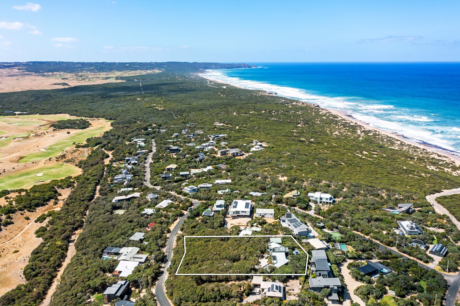 Set on just over one acre (4,406 sqm approx) “Pezula” is privately concealed behind a natural screen of established native moonah trees lining its impressive driveway and entrance. The four/five-bedroom residence, complete with a separate studio, enjoys a truly rare 360-degree outlook across the Mornington Peninsula. Panoramic views extend from the blue waters of Bass Strait across the rolling dunes of the St Andrews Beach Golf Course, through to Cape Schanck, with Arthurs Seat rising on the horizon.