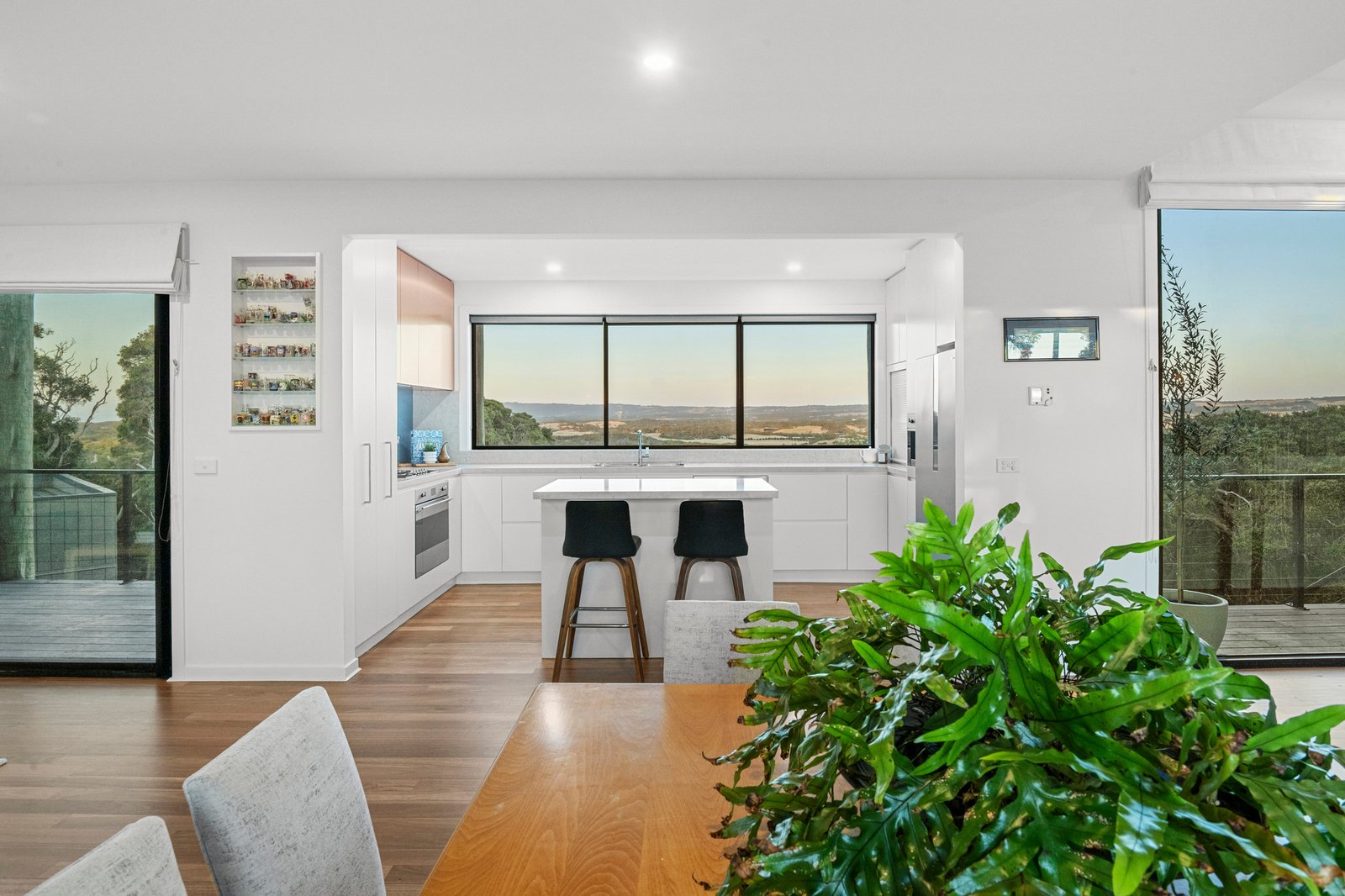 Beyond the striking vertical timber façade, the home reveals a fully renovated interior where every detail has been thoughtfully considered to deliver a refined, move-in-ready lifestyle. Light-filled living and dining zones are framed by multiple entertaining decks, a rooftop terrace and a balcony, with expansive picture windows creating a seamless connection to the surrounding landscape. The well-appointed kitchen features premium finishes, including stone benchtops, Smeg appliances with integrated coffee machine, and a concealed sliding pantry, offering both functionality and timeless style. The main living area is warmed by a stacked-stone open fireplace and overlooks the heated plunge pool and spa, ideally positioned to capture breathtaking western sunsets.