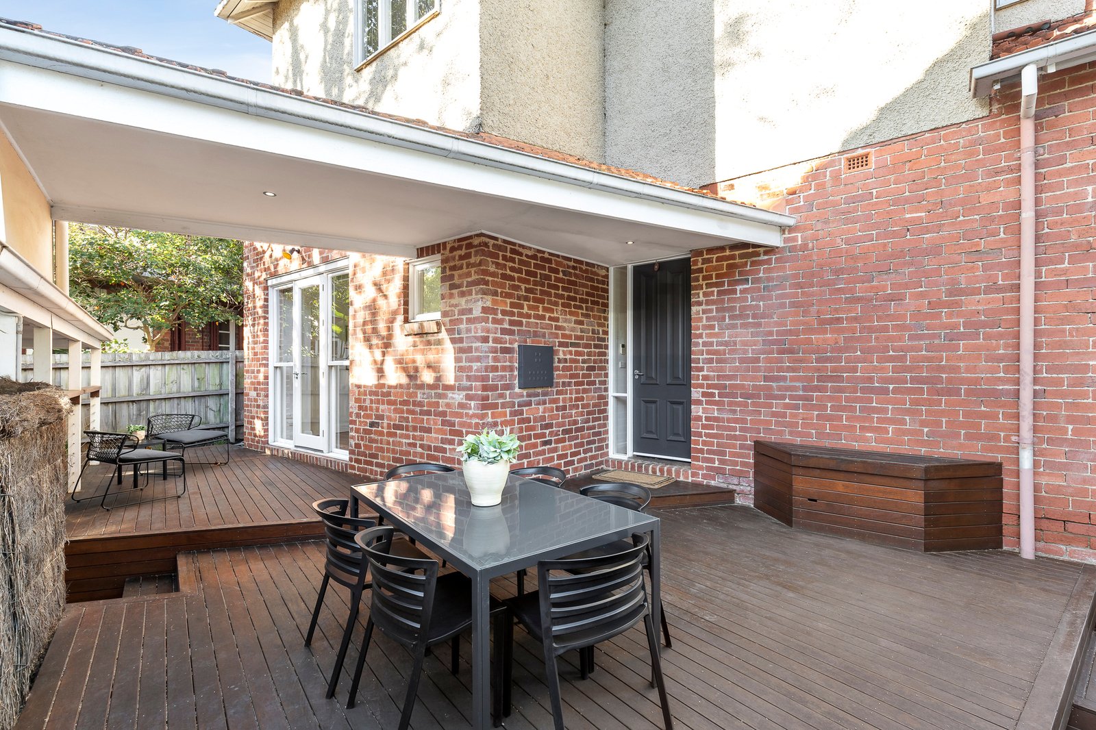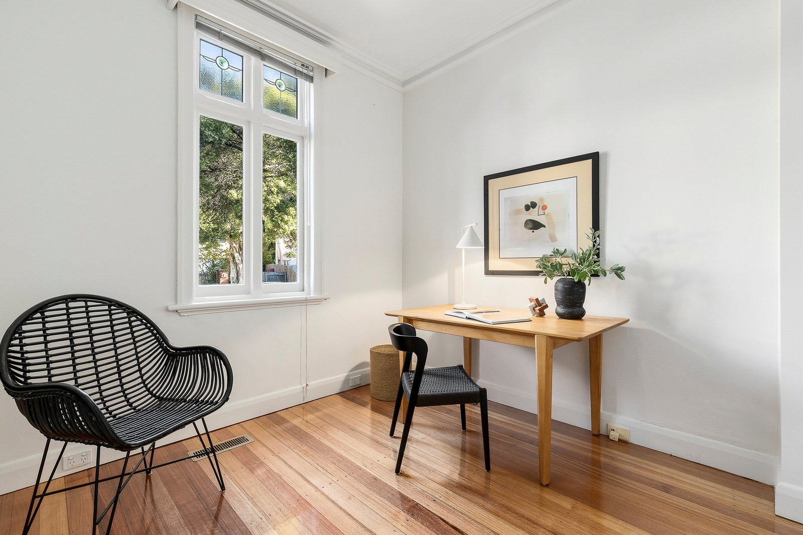 Tucked quietly between the vibrant hubs of Elwood and St Kilda, the red-brick semi immediately impresses with freshly painted interiors, newly polished floorboards, and a spacious, light-filled layout. A stunning family room sets the scene with a curved leadlight bay window, open fireplace, and high strapped ceilings, creating an inviting space for both living and entertaining.