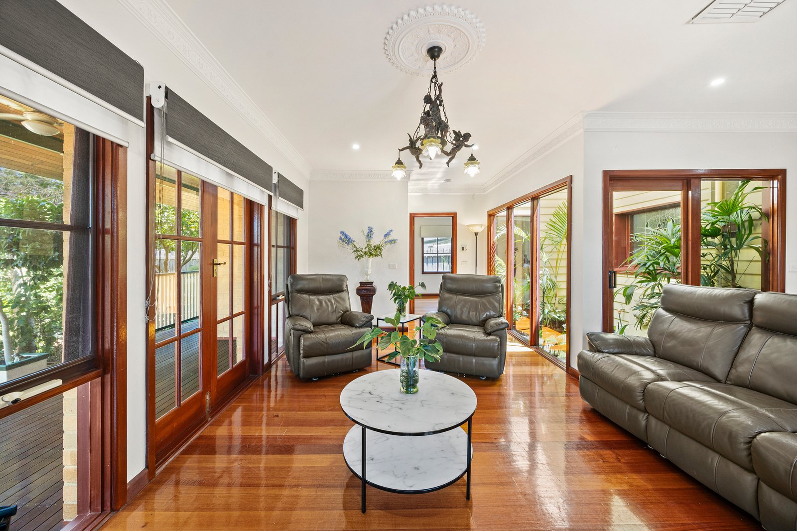 Classic L-shaped formal living & dining offers flexibility, complemented by a bespoke timber kitchen with a Miele oven & a style of its own. Continuing the flow, a central casual meals set under a skylight & open plan living are heightened by a real atrium enhanced by a water feature adding to the Feng Shui feel. A traditional wrap around verandah accessed by French doors, is a cool place to entertain & a brilliant spot for kids to play.