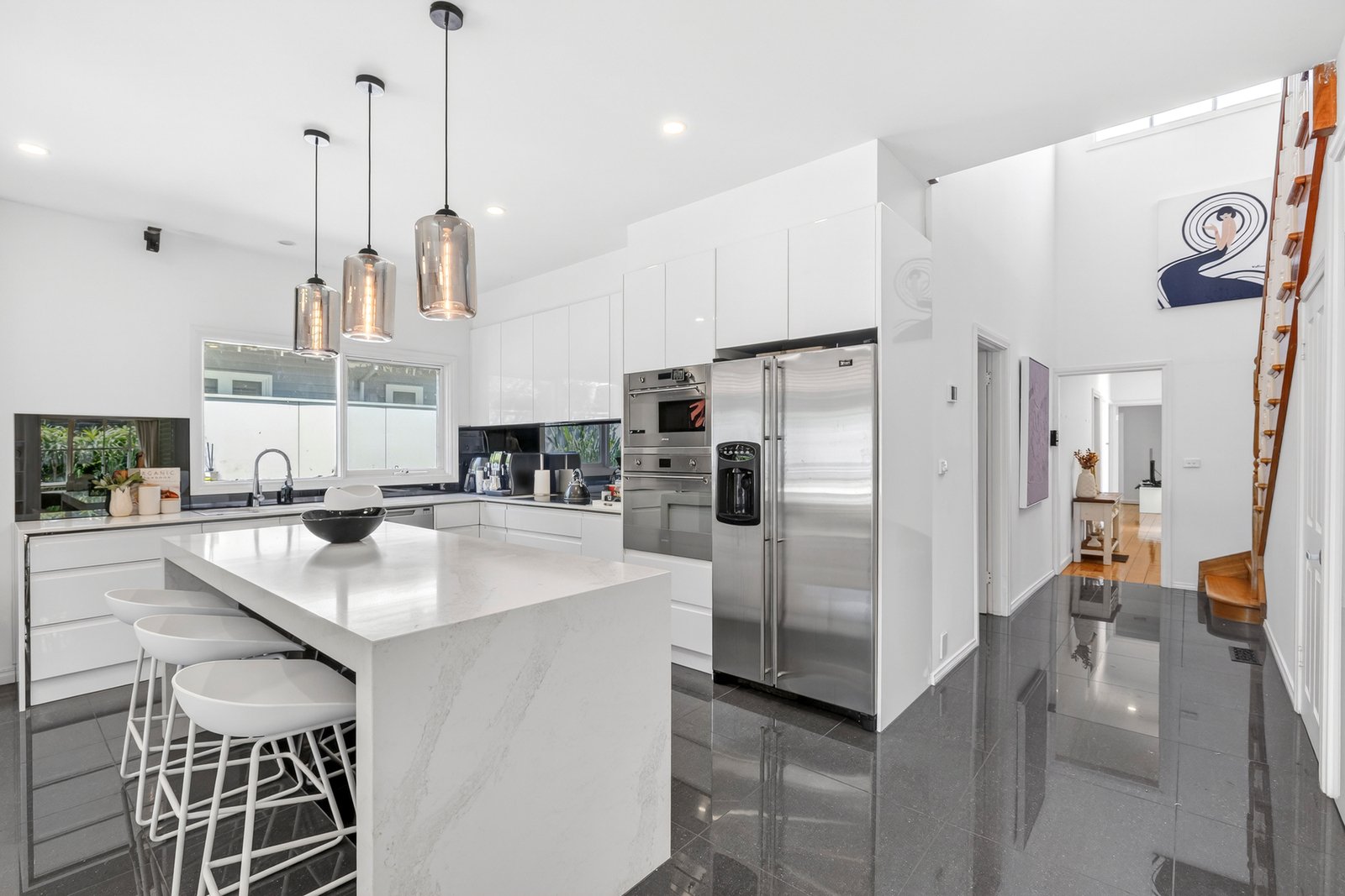 Appointed in streamlined style with plantation shutters, plush new carpets and solid timber floors, this stunning home stars stainless steel appliances in the high-end kitchen, sleek stone bench tops, soft-close cabinets and a jet spa for the ensuite bathroom.