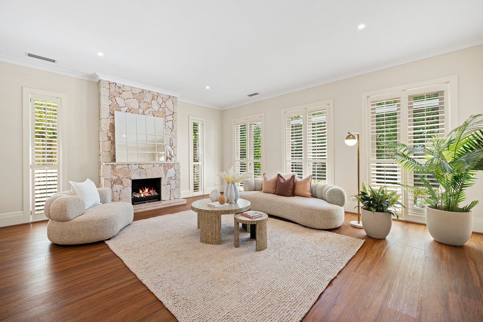 Inside, warmth and material richness immediately define the home. High ceilings, timber detailing, plantation shutters and natural stone finishes create a layered, inviting aesthetic that feels timeless rather than showy.