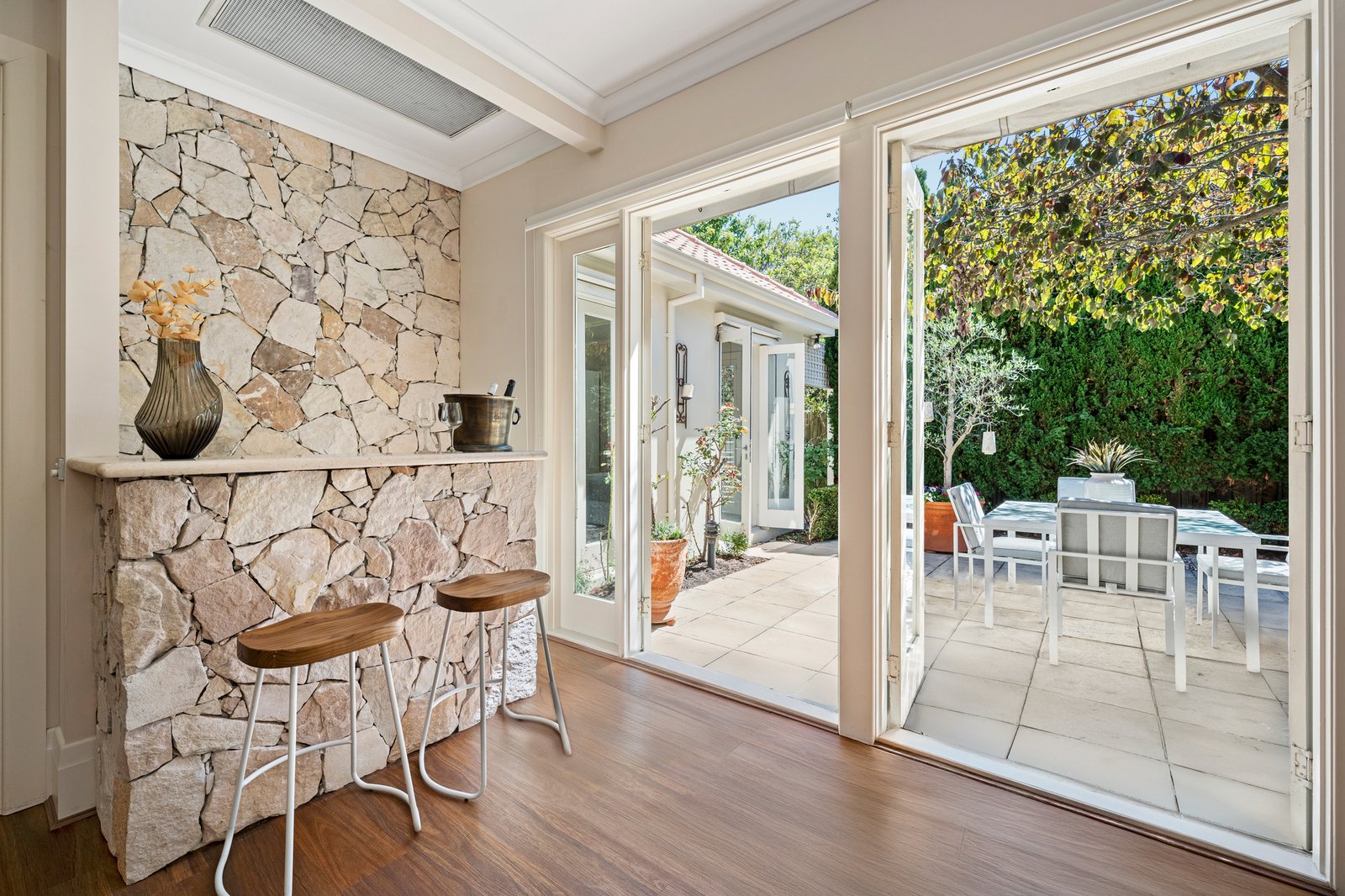 At the heart of the home, the expansive family living and dining domain is designed for connection and ease. A striking fitted bar provides a focal point for entertaining, while a series of French doors open seamlessly to the courtyard, where established trees provide dappled shade, privacy and a tranquil backdrop for al fresco dining, morning coffee or long afternoons spent unwinding.