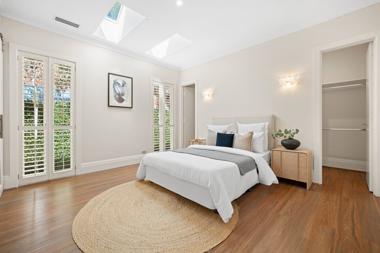 The main bedroom suite is privately positioned and beautifully curated, featuring an expansive walk-in wardrobe and a luxurious ensuite with twin vanity, creating a peaceful sanctuary of impressive scale.