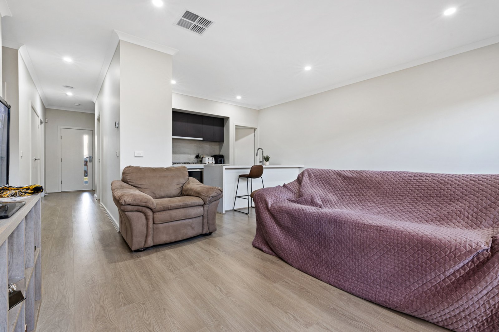 Upon entry, you are welcomed into a light-filled open plan living zone that seamlessly combines the kitchen, dining and living areas, creating an ideal space for both everyday living and entertaining. The contemporary kitchen is well appointed with a built-in pantry, 900mm gas cooktop, electric oven and dishwasher, all overlooking the dining and living area for effortless functionality. Comfort is assured year-round with ducted gas central heating and evaporative cooling throughout, complemented by a security alarm system for added peace of mind.