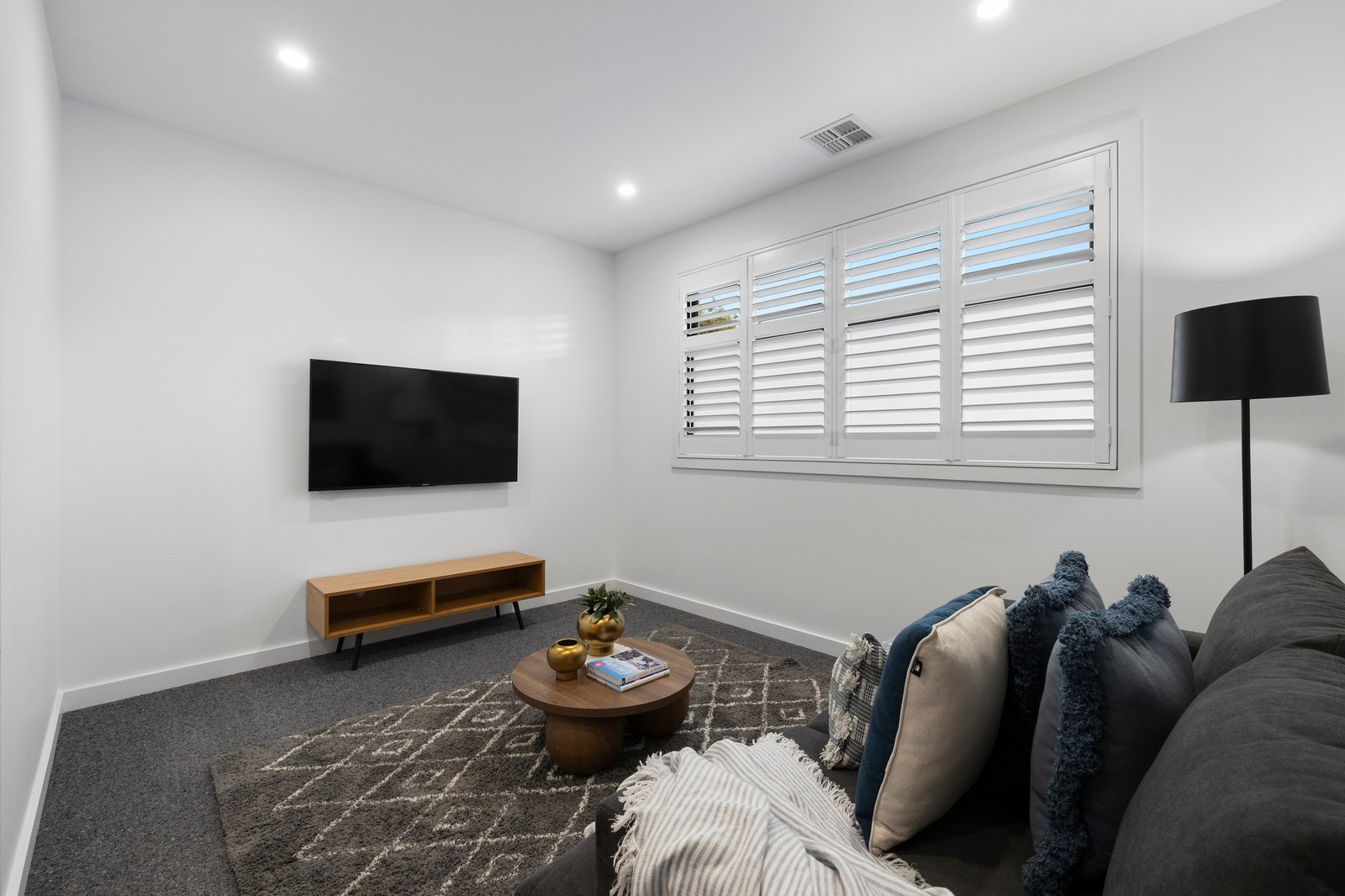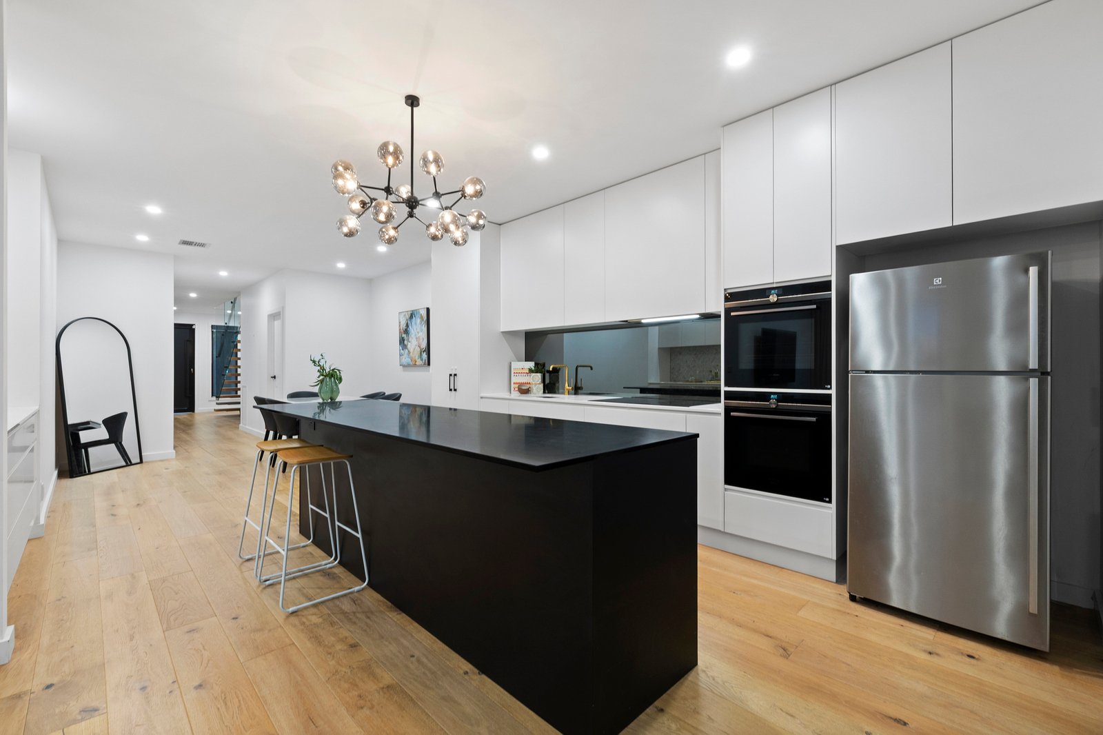 Beyond a landscaped front garden, chic oak flooring and luxe plantation shutters enhance the high-quality accommodation which features a free-flowing living & dining zone anchored by a gourmet kitchen. Offering a suite of Siemens appliances including an induction cooktop, twin ovens and an integrated dishwasher along with stretches of stone and prestige cabinetry, this space sets a sleek scene for entertaining.