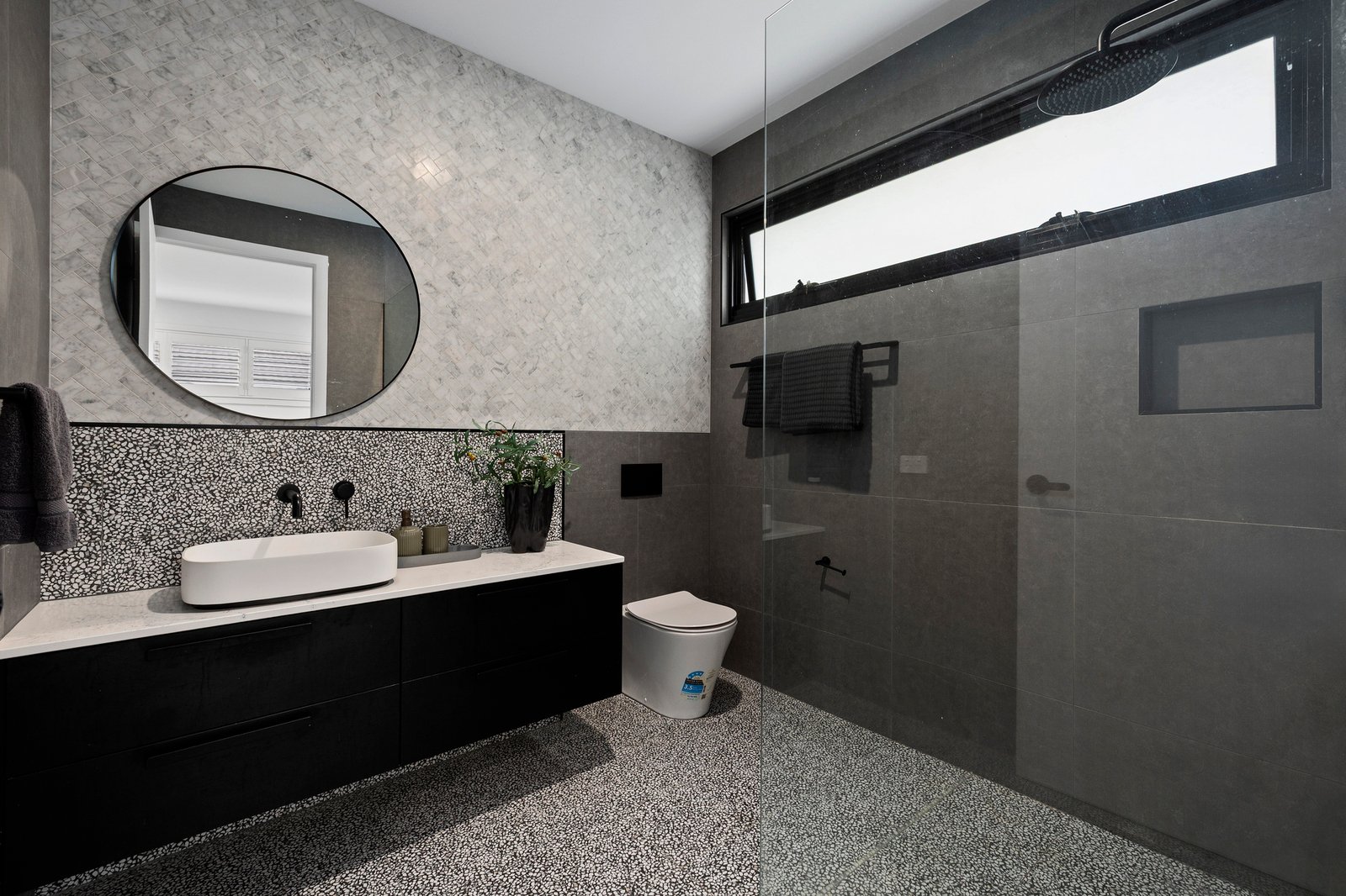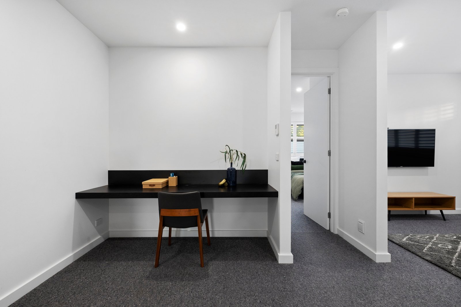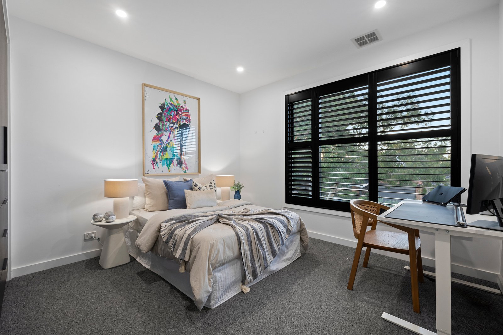 The first of two bedrooms offering luxurious ensuites is desirably located downstairs, while three further true double bedrooms including the primary suite are nestled upstairs - each one featuring ample built-in wardrobing. A sophisticated fully tiled family bathroom complete with bath and handy separate WC services the upper-level which also provides a versatile retreat room with generous study zone.