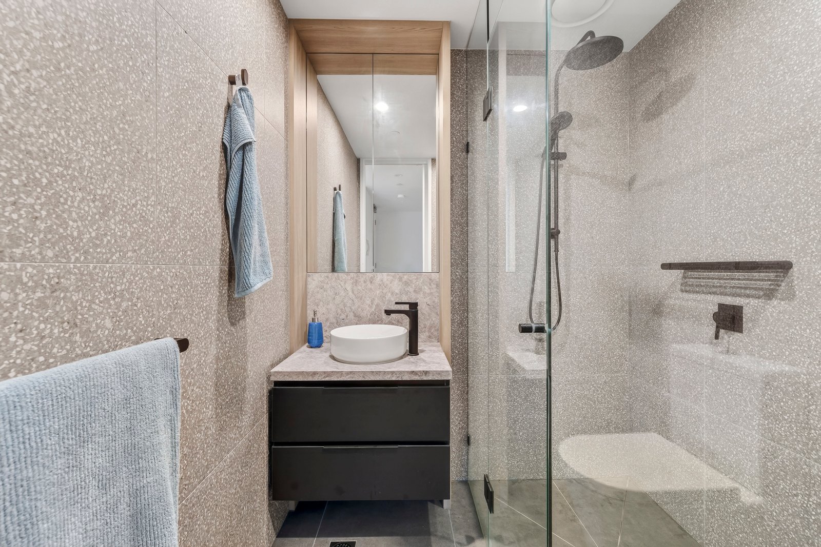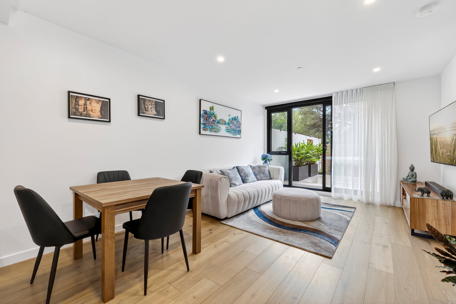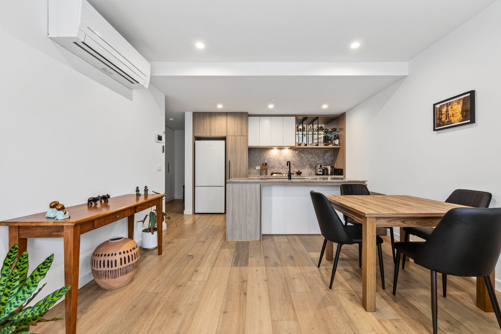 Behind a secure video intercom entry, the residence pulls you into its sun-soaked living room that opens onto the full width alfresco and garden that’s unusual for this mode of living. Overlooked by a generous kitchen with gas cooking, dishwasher and a robust stone island bench.