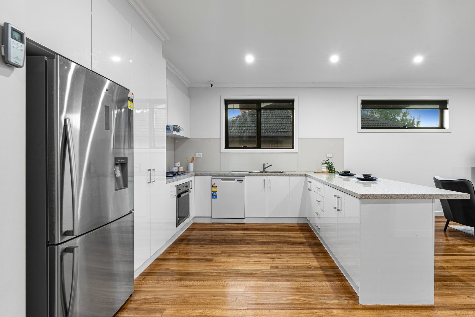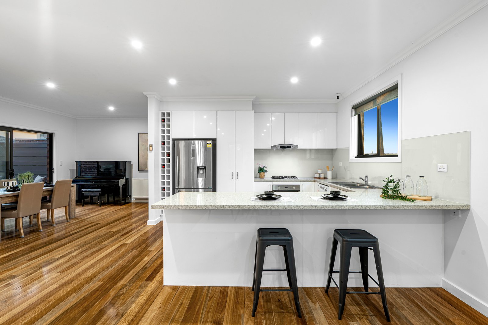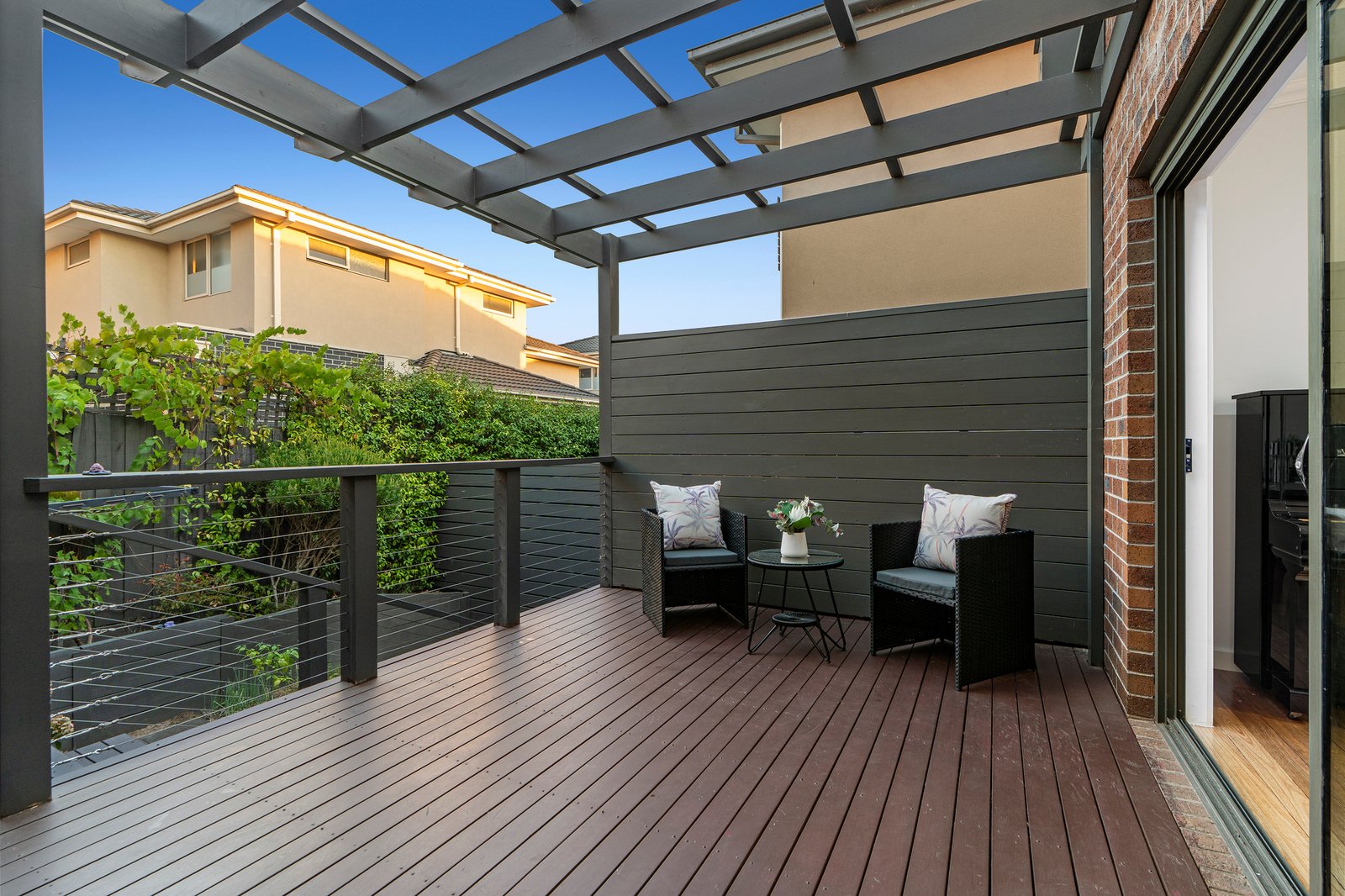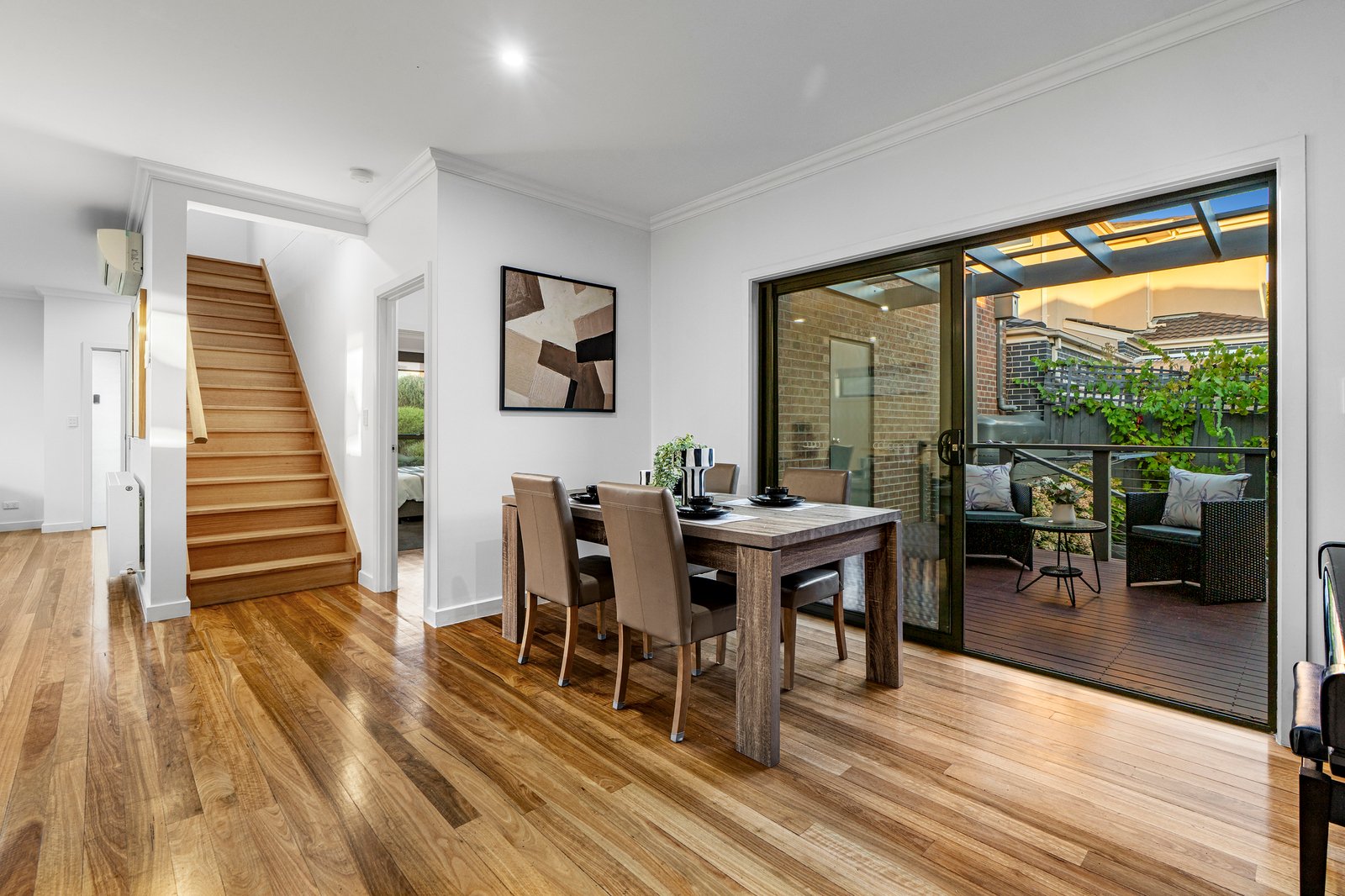 Beautifully streetfront, this luxurious town residence raises the benchmark for quality low-maintenance living. All the elements and every detail that one desires have been considered, with stunning timber floors and beautiful natural light filtering through spacious living and dining areas, separated by a sleek stone kitchen. A convenient ground floor bedroom and bathroom highlights family flexibility, whilst 3 upper level robed bedrooms, bathroom and retreat amplify a sense of space. Finished to perfection with hydronic heating, split system AC, entertaining deck, water tank and DLUG, located in the esteemed MWSC catchment, a walk to Burwood Highway trams, buses, Deakin University, PLC, shops and Gardiners Creek parkland.