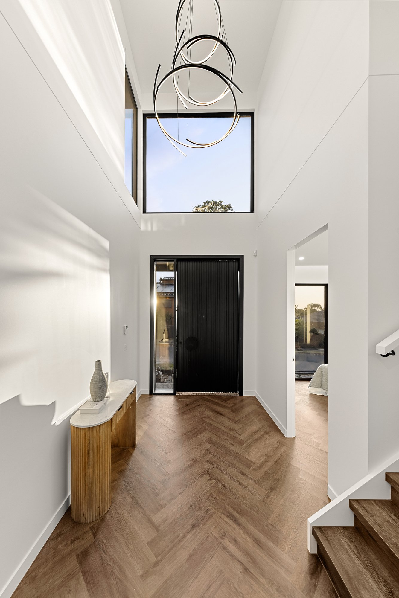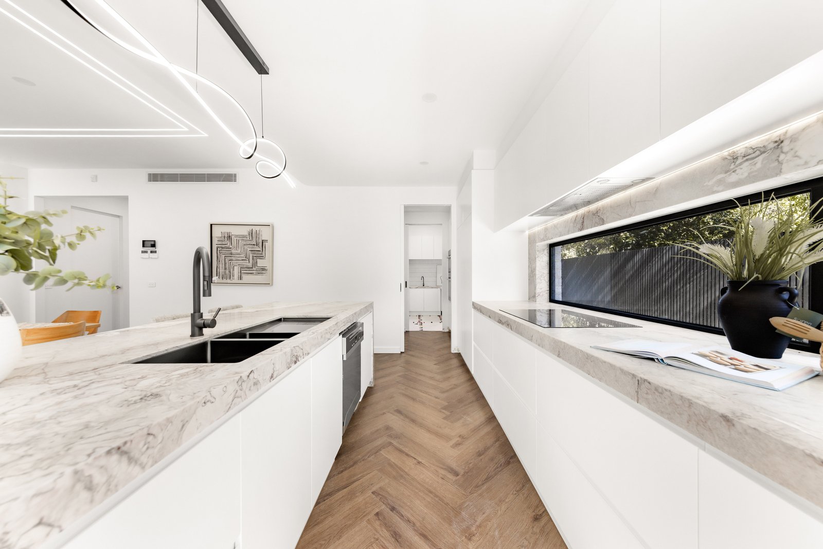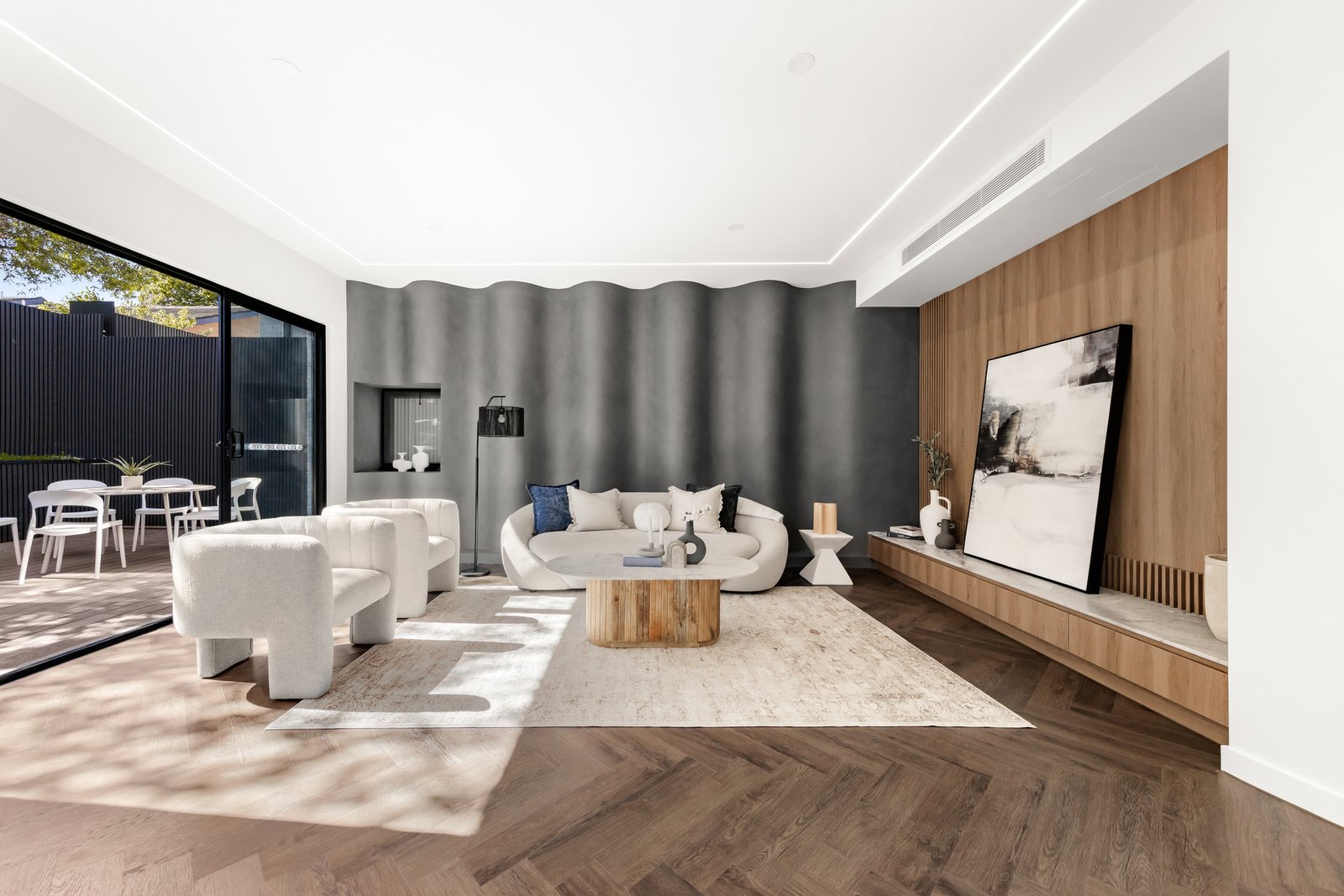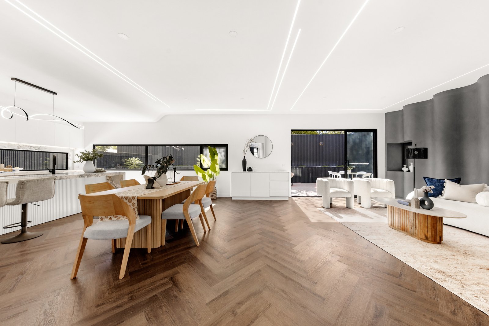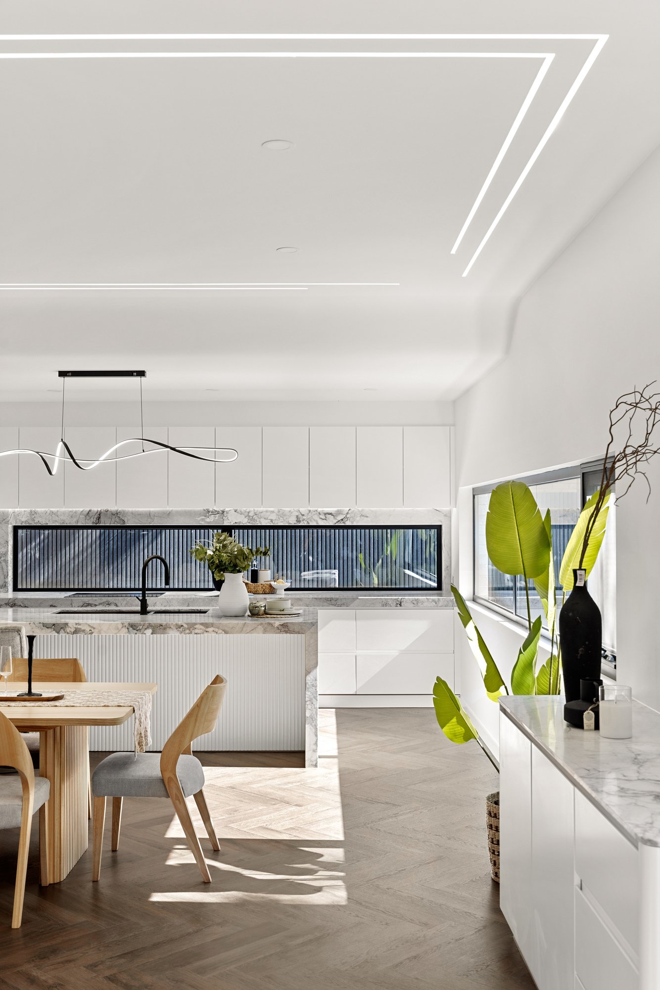 Envy inducing from the moment you arrive, the home’s bold exterior sits above street level and balances timber slat-work with large panels of glass, opening onto a lavish entry void with designer lighting. Sculptural finishes catch your eye as you venture into the open plan living and dining zone boasting a wave feature wall, inlaid LED strip light details and elegant parquetry flooring creating a luxurious environment for everyday life.