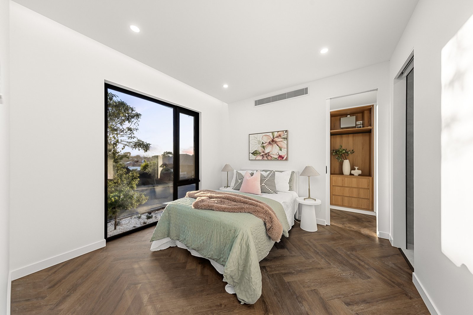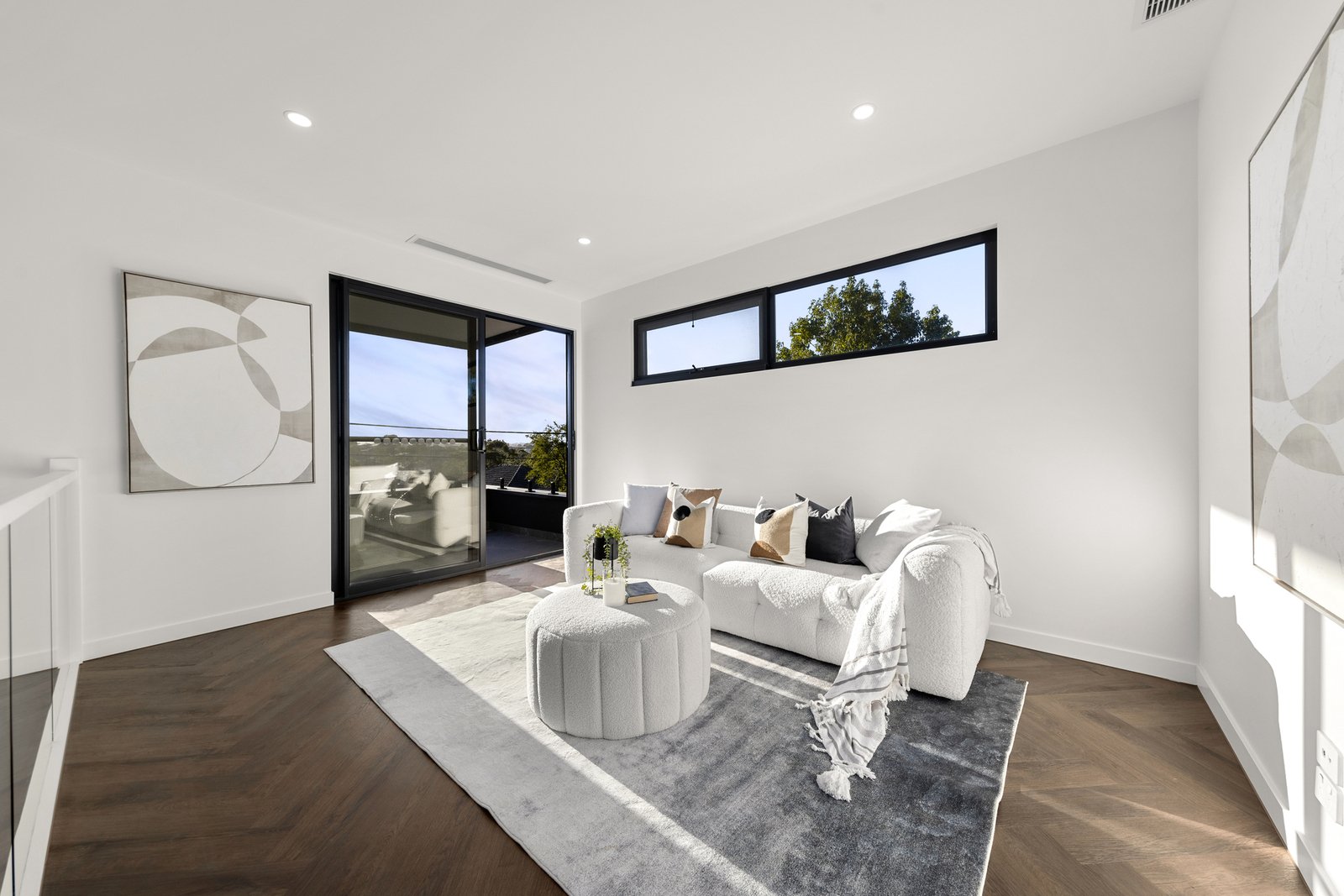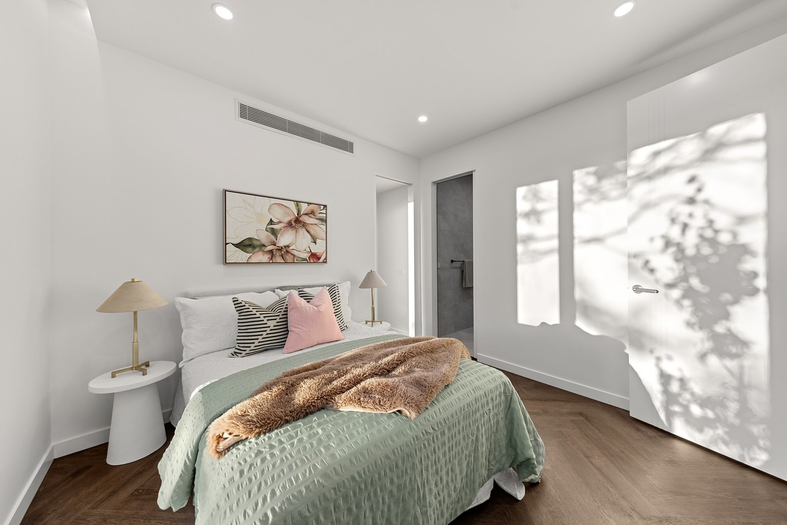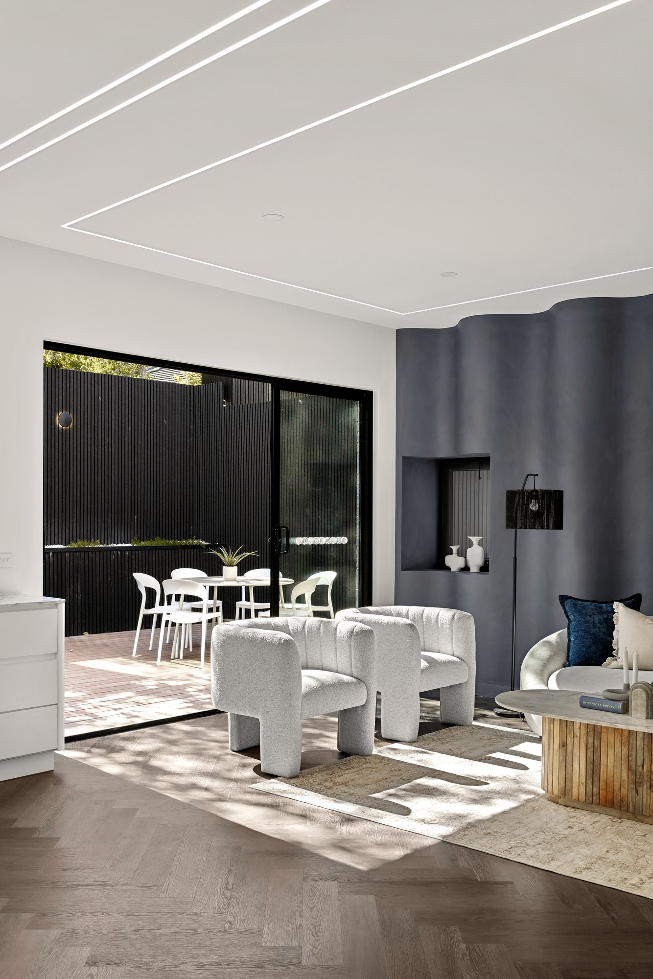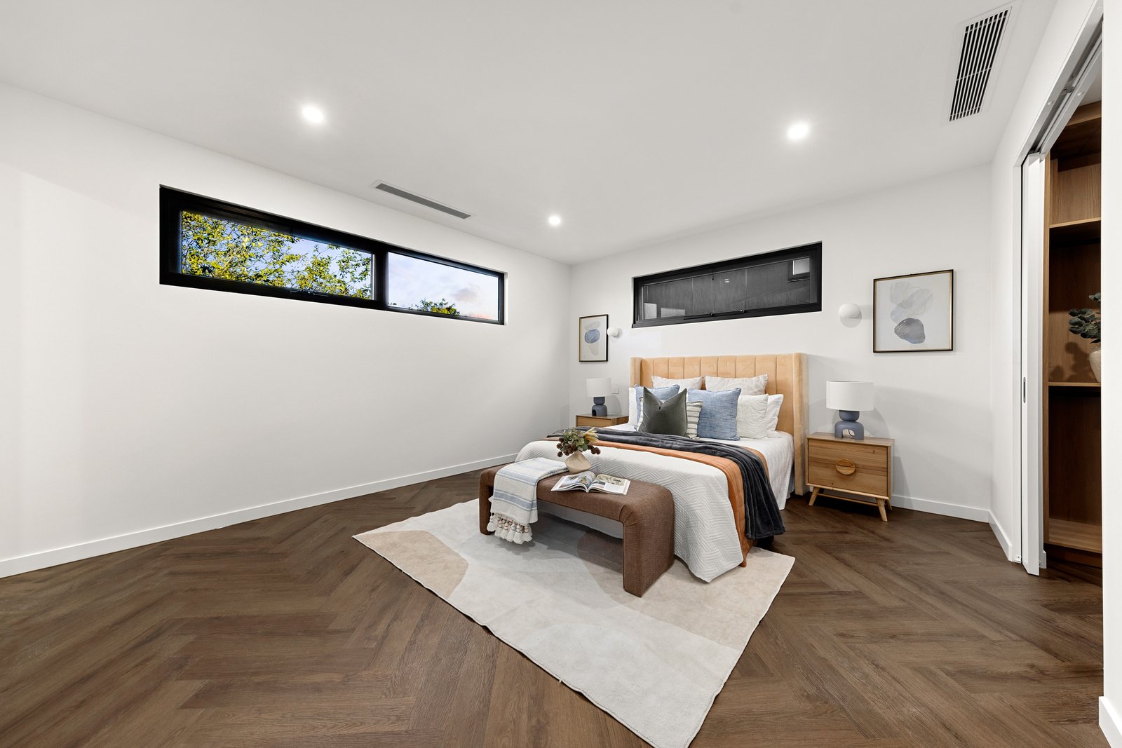 Envy inducing from the moment you arrive, the home’s bold exterior sits above street level and balances timber slat-work with large panels of glass, opening onto a lavish entry void with designer lighting. Sculptural finishes catch your eye as you venture into the open plan living and dining zone boasting a wave feature wall, inlaid LED strip light details and elegant parquetry flooring creating a luxurious environment for everyday life.
