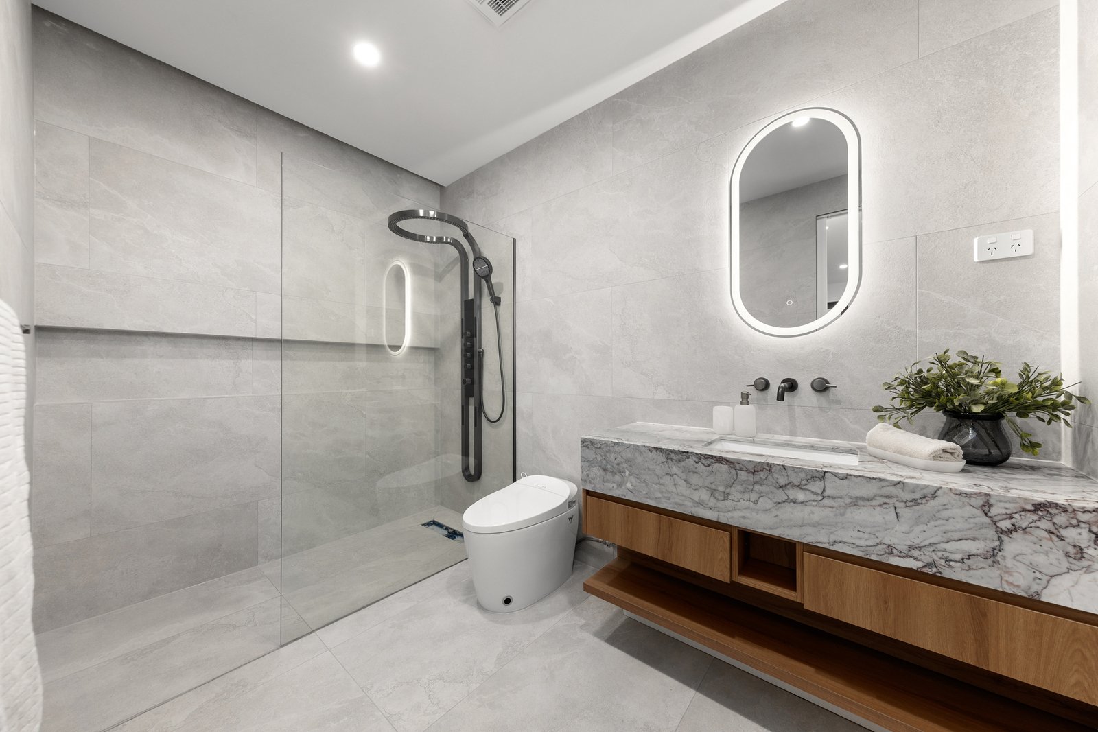 Custom craftsmanship continues into all four bedrooms, with master bedrooms gracing both levels featuring elegantly fitted walk-in-robes and ensuites with floor-to-ceiling tiles, 2 smart toilets, touch screen mirrors and magnificent halo waterfall showers. The main/dual vanity 3rd bathroom is similarly styled with the same luxurious halo shower and touch screen mirrors, accompanied by two powder rooms, one on each level.