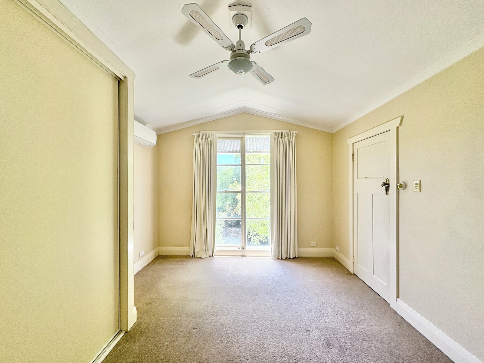 - Upstairs bedroom featuring built-in robes, ceiling fan and split system heating and cooling for year-round comfort