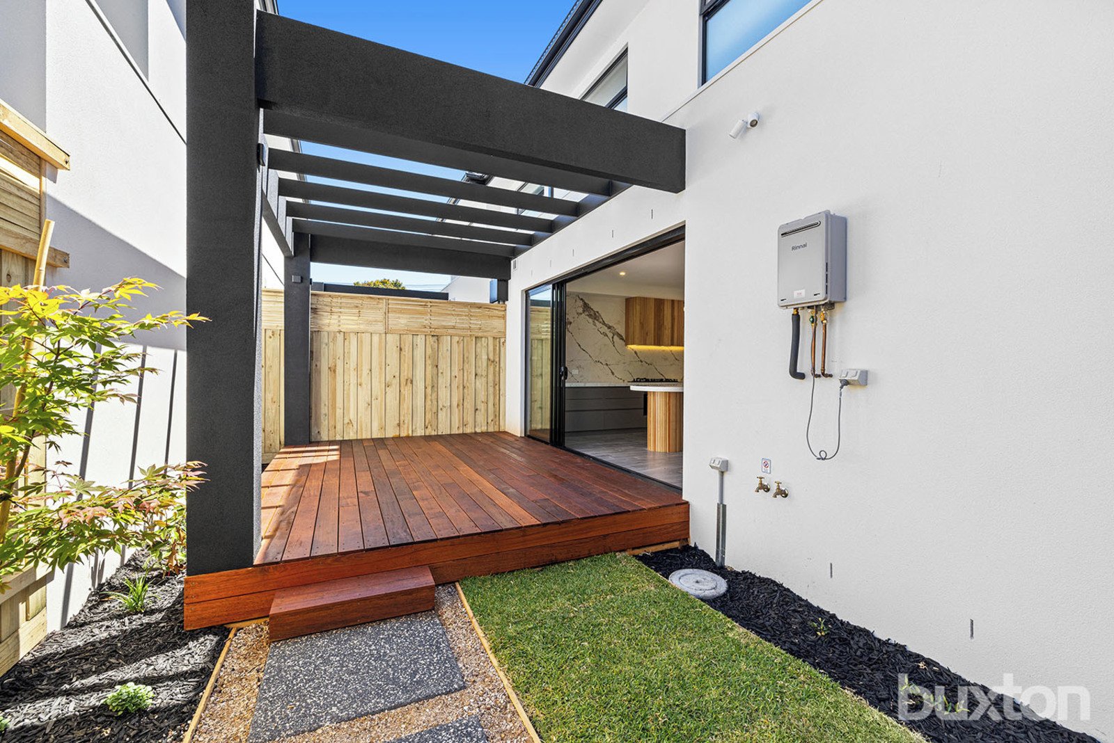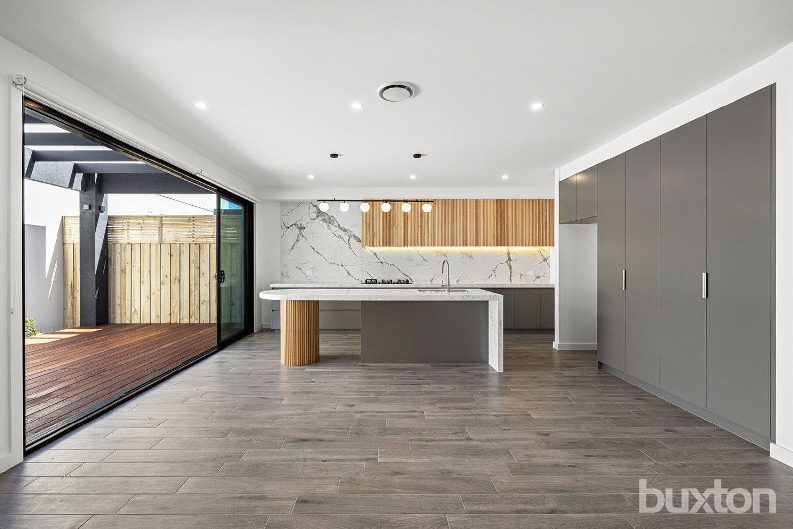 The ground floor includes a master bedroom with built-in robes and a private ensuite, along with a separate laundry and powder room. At the heart of the home is an expansive open-plan living and dining area, complemented by a striking eat-in kitchen with stone waterfall benchtops, gas cooktop, integrated dishwasher, 900mm oven, and ample pantry storage. Stacker doors open to a decked outdoor courtyard, ideal for entertaining.