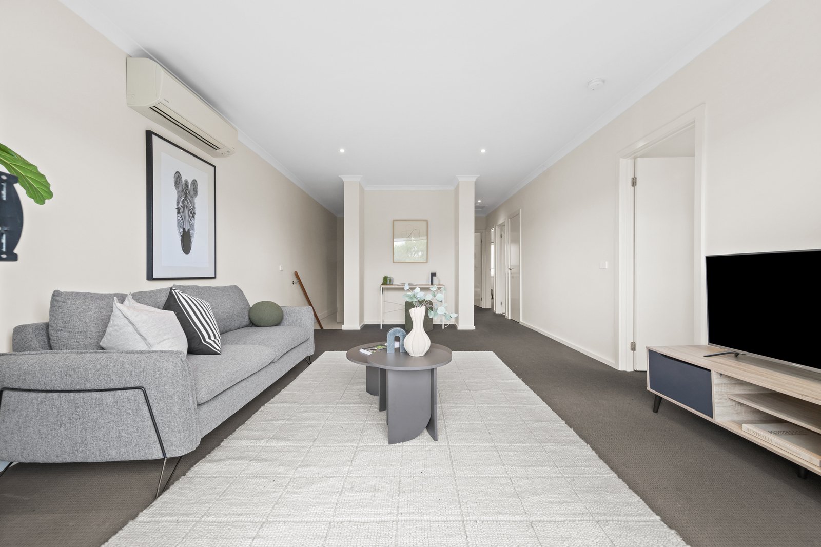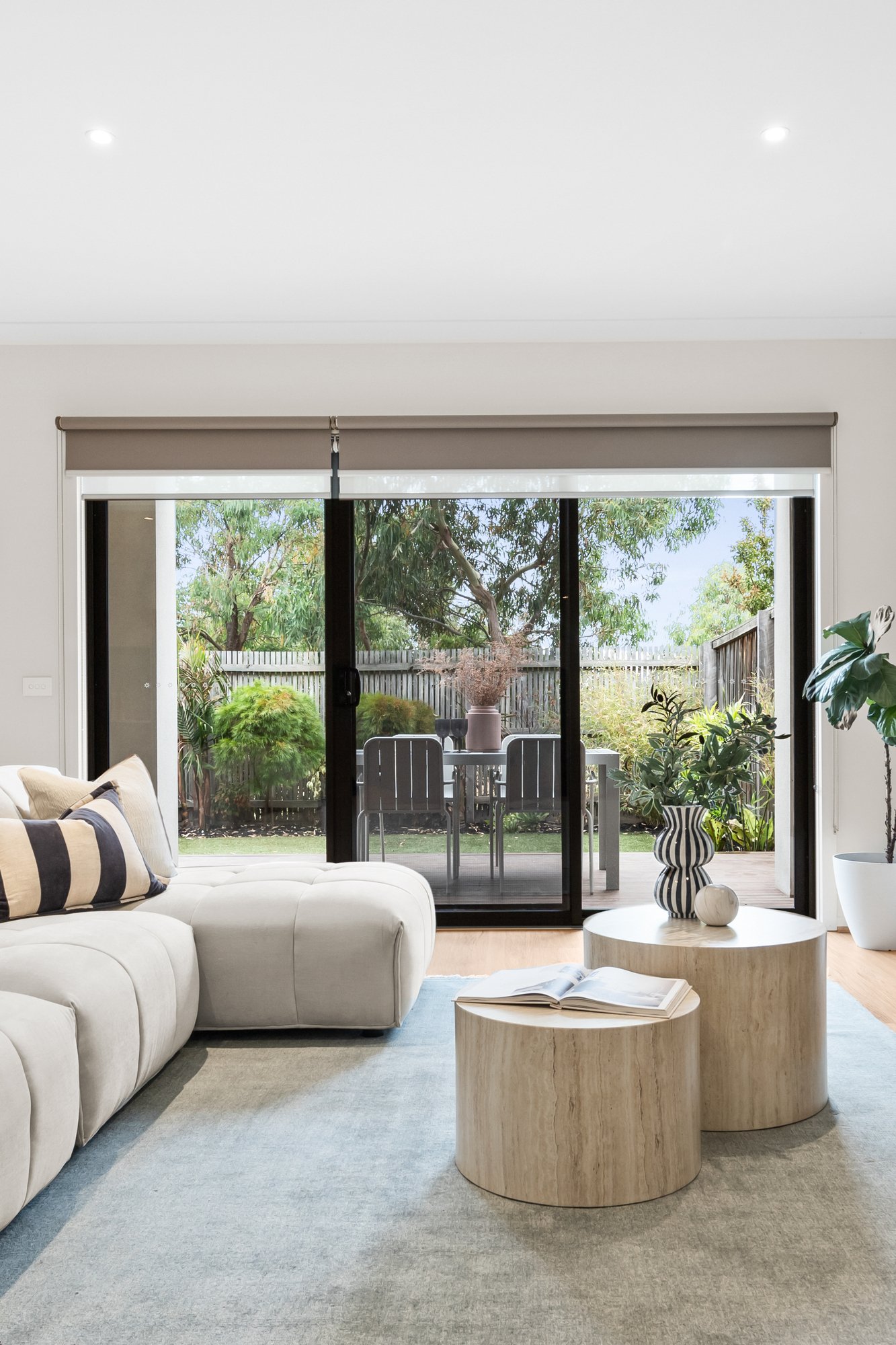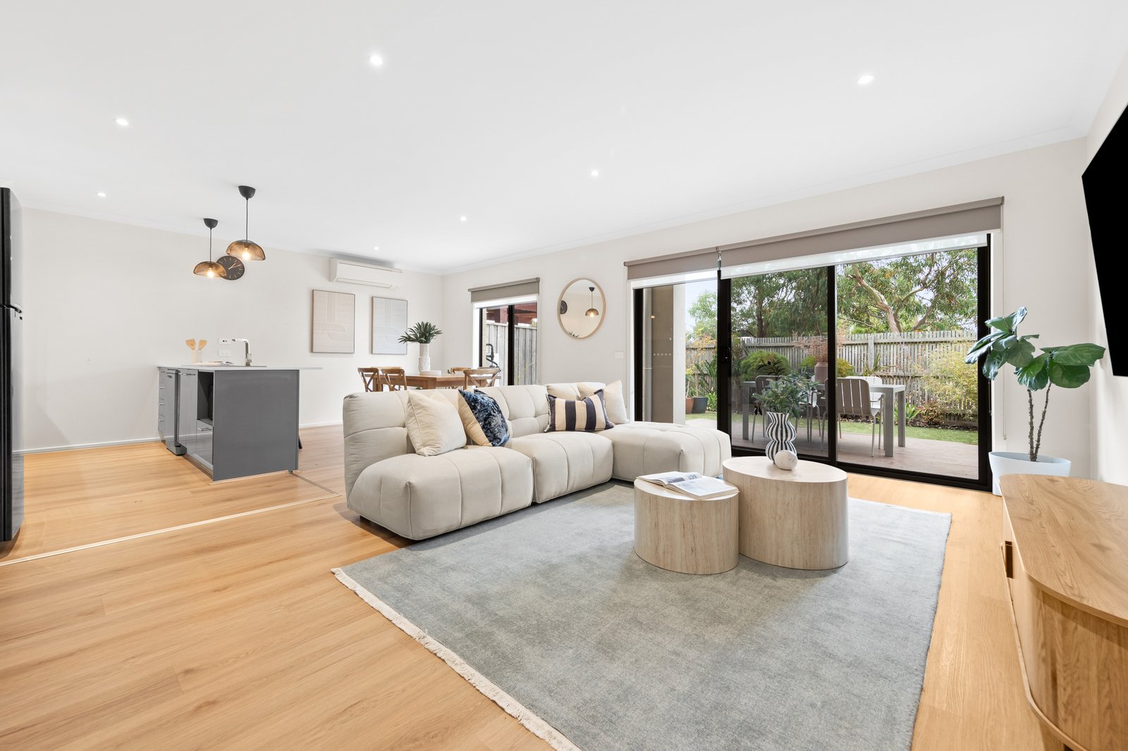 Inside, the open plan layout reveals a living area that flows effortlessly into the well appointed kitchen, complete with a premium Smeg oven and stove plus a Fisher & Paykel dishwasher, perfect for the passionate home cook. The adjoining dining area is ideally positioned for relaxed everyday meals, creating a warm and functional hub for family living.