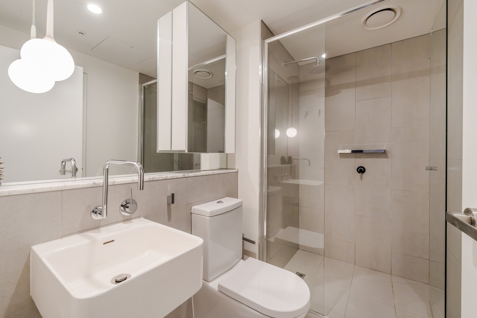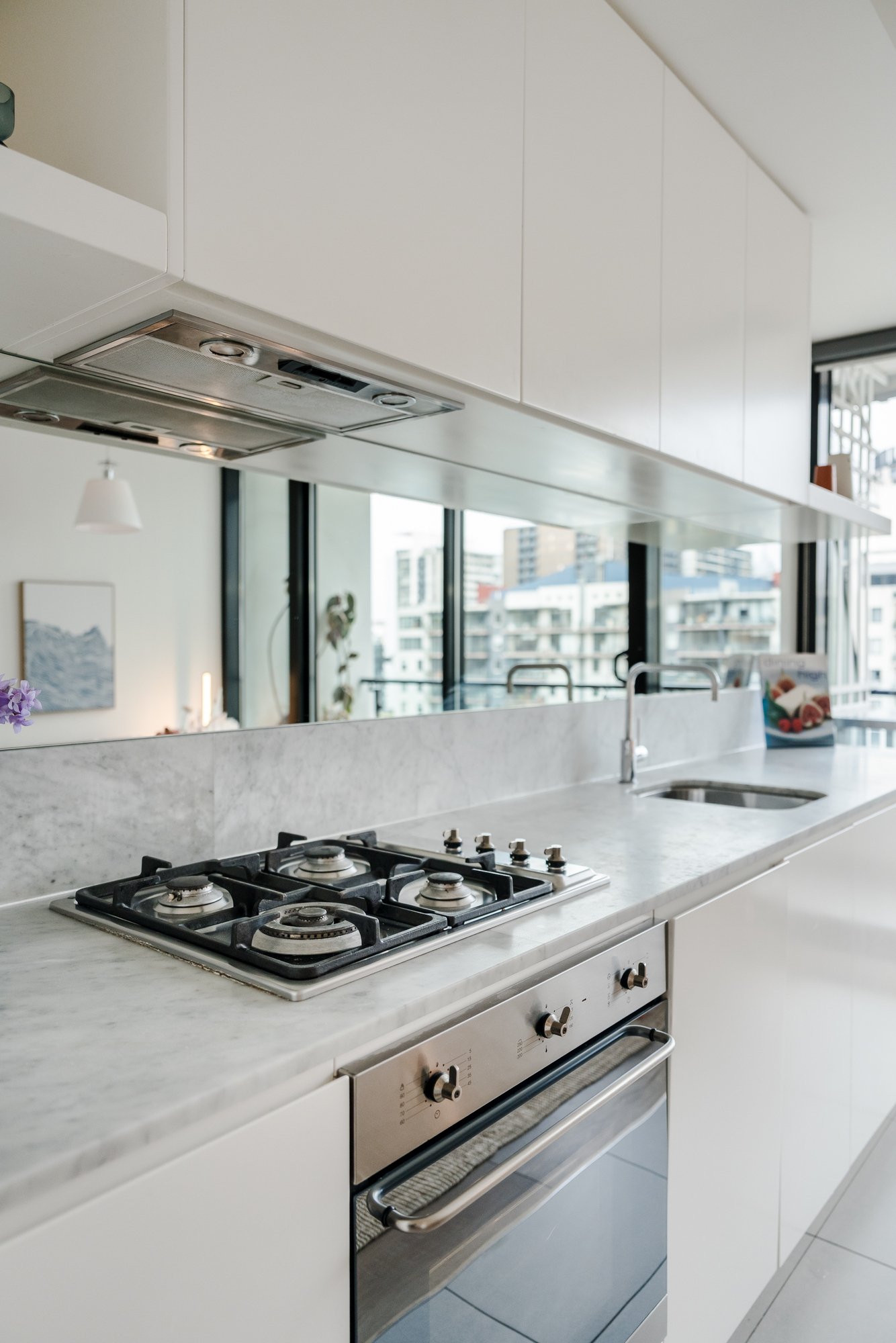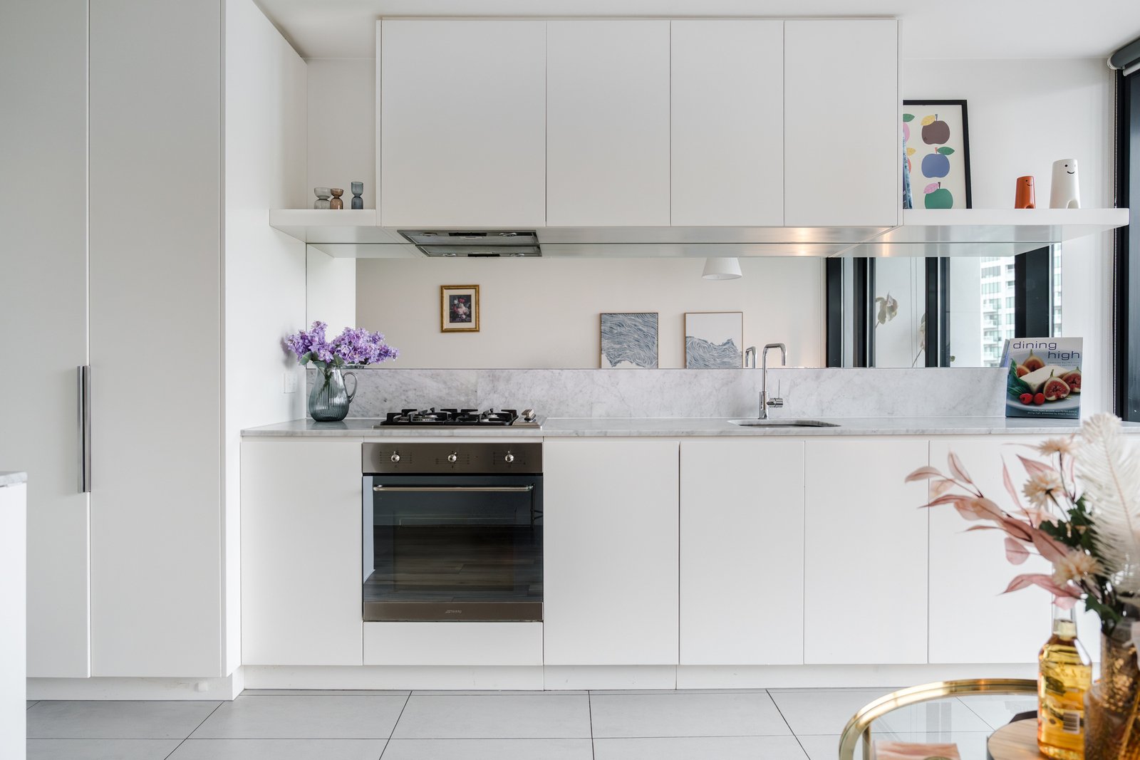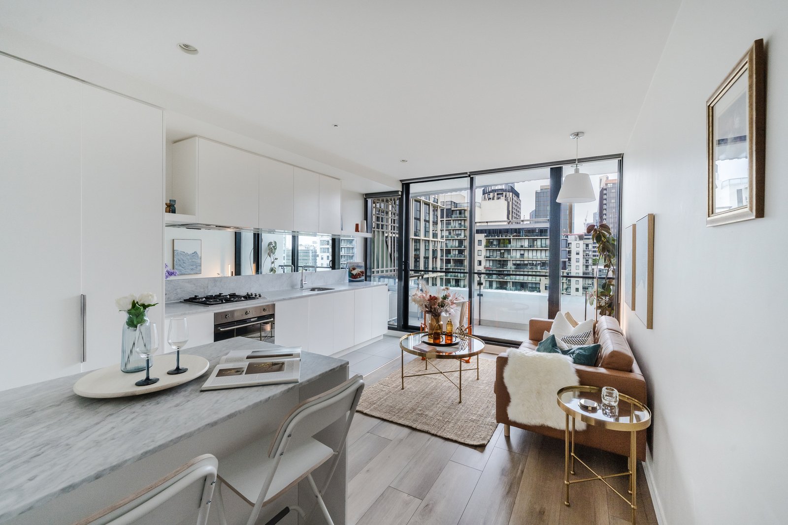 The apartment features a bright open plan living and dining area enhanced by abundant northern light, complemented by a stunning marble topped kitchen with breakfast bar, mirrored splash back and quality Smeg appliances, plus an integrated fridge. Glass doors open to a covered balcony capturing sweeping northern views across the city skyline, including Eureka Tower and Australia 108. The spacious bedroom includes mirrored built in robes and is serviced by a stylish bathroom finished with floor to ceiling tiles, marble detailing and a rainfall shower.