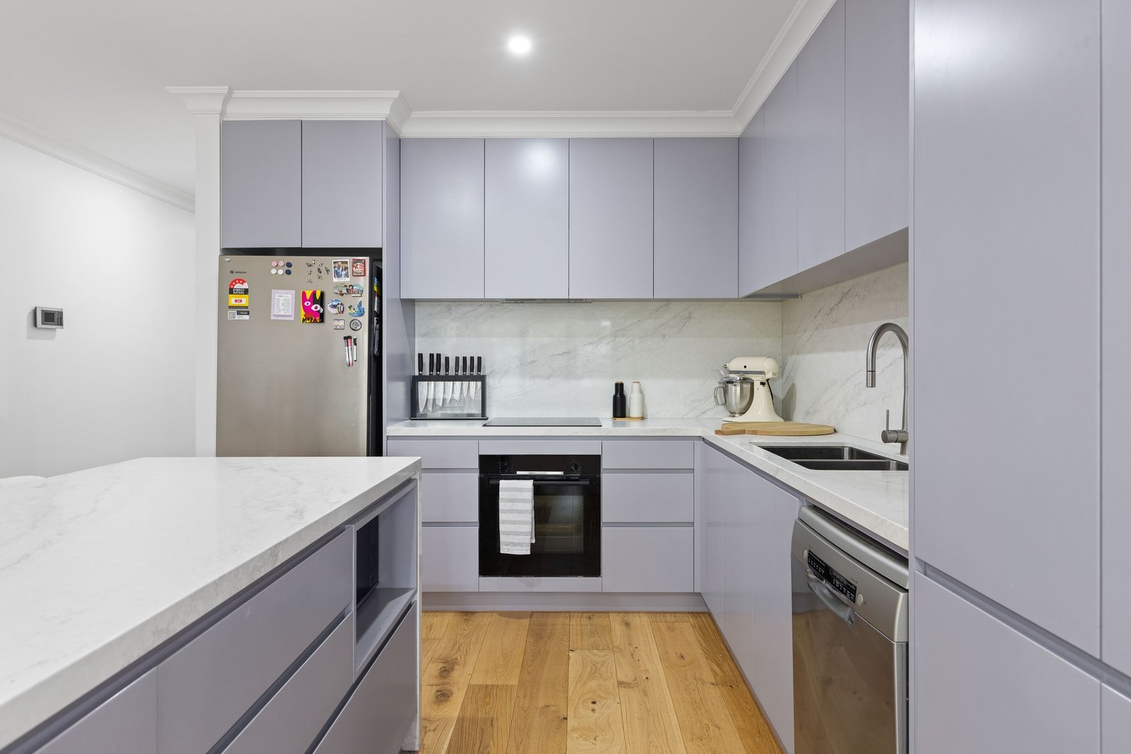 The home is anchored by a fully renovated kitchen, showcasing premium Bosch appliances, a Schweigen rangehood, sleek cabinetry and quality finishes. Flowing seamlessly into the light-filled open-plan living and dining area, the home is enhanced by Havwoods premium timber flooring throughout and upgraded LED lighting, creating a warm, contemporary and energy-efficient interior.
