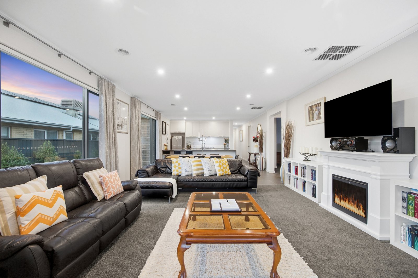 Inside, the home is immaculate in presentation and thoughtfully designed with two separate living zones, including a formal lounge ideal for quiet evenings or entertaining guests. The heart of the home is the expansive open-plan kitchen, meals and living area, enhanced by 9ft ceilings, 8ft doors and an abundance of natural light. The upgraded kitchen is a standout, featuring 40mm stone benchtops with waterfall edges, a 900mm gas cooktop, separate 900mm electric oven, and a generous walk-in pantry, making it as functional as it is stylish.