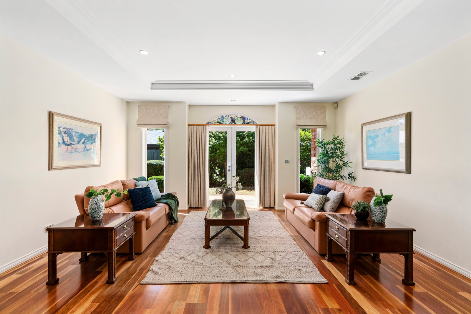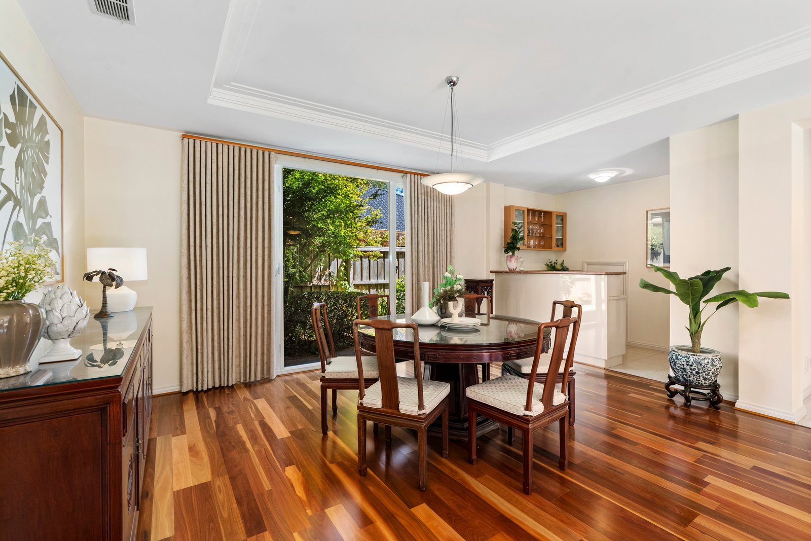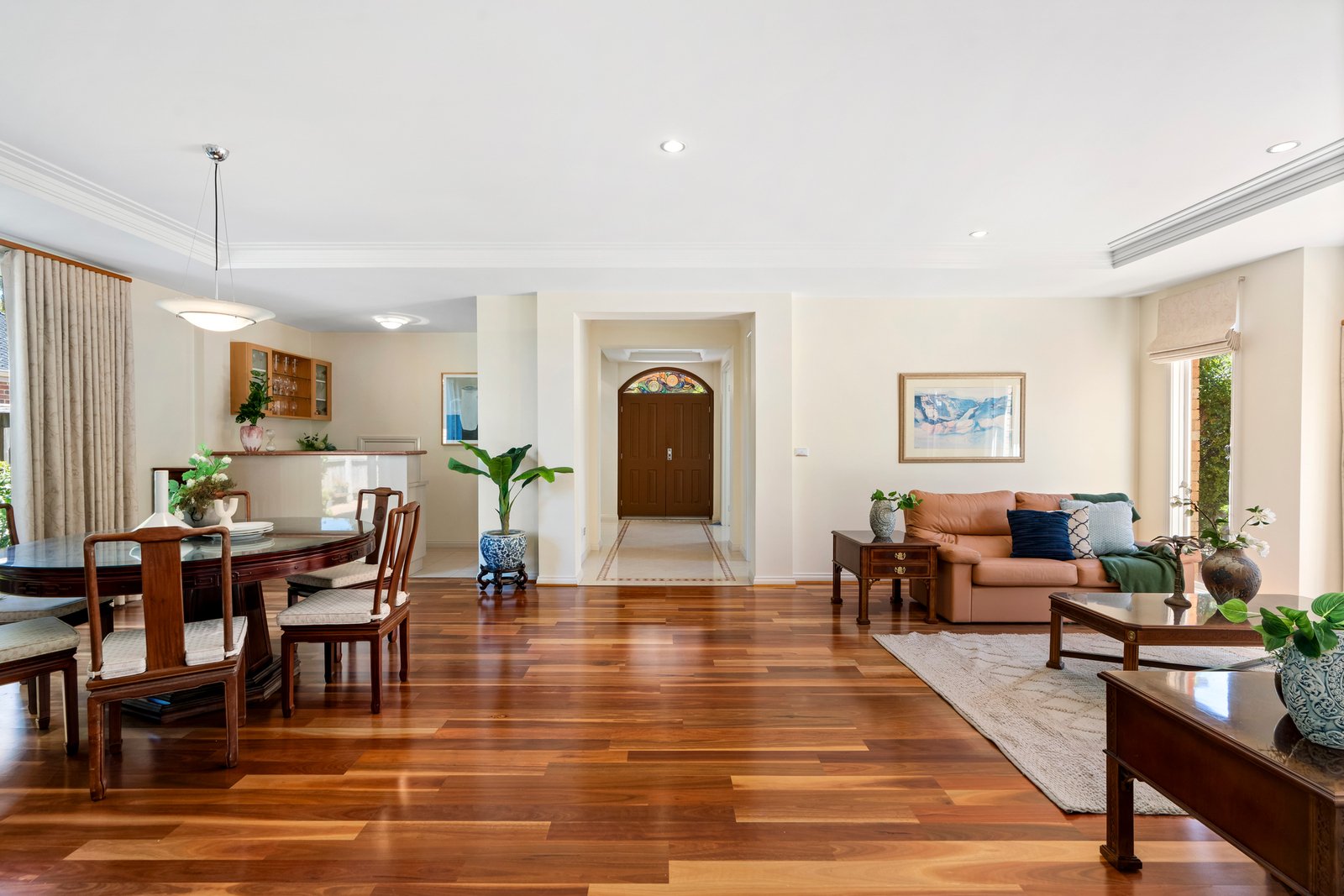 As you move across the home’s grand expanse, you can’t help but notice the immaculate presentation and the signature design elements. Picture windows frame the garden. Coffered ceilings bring refinement. Leadlight windows add artistry.