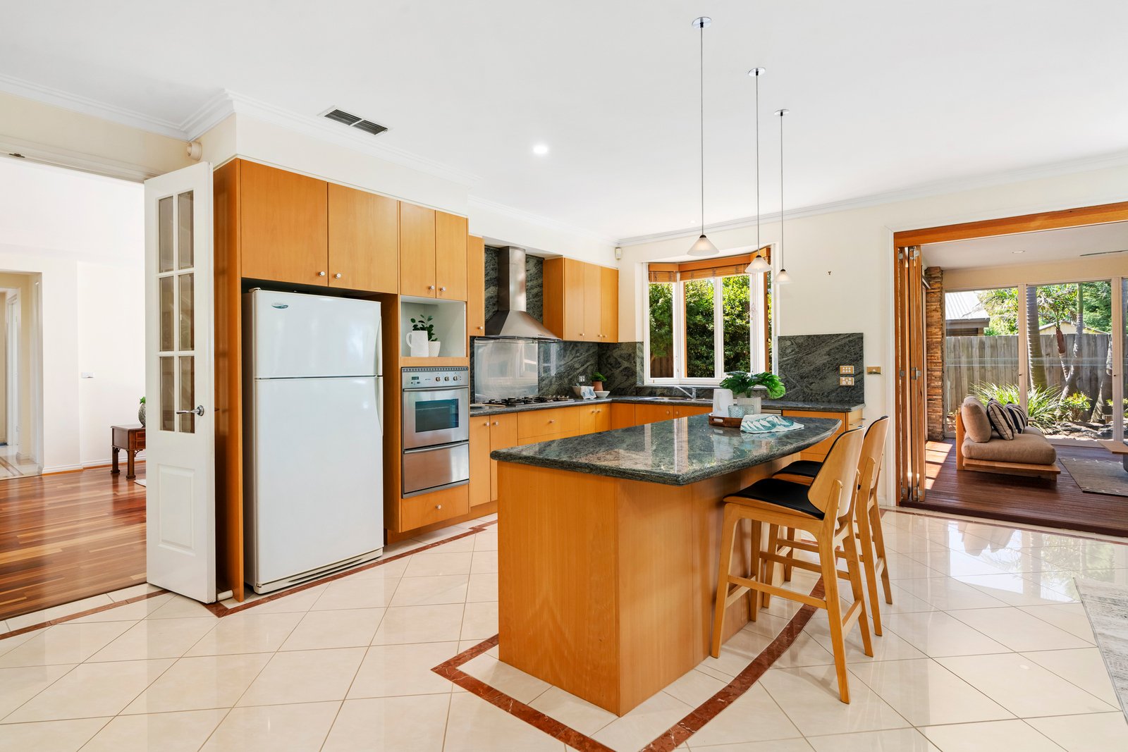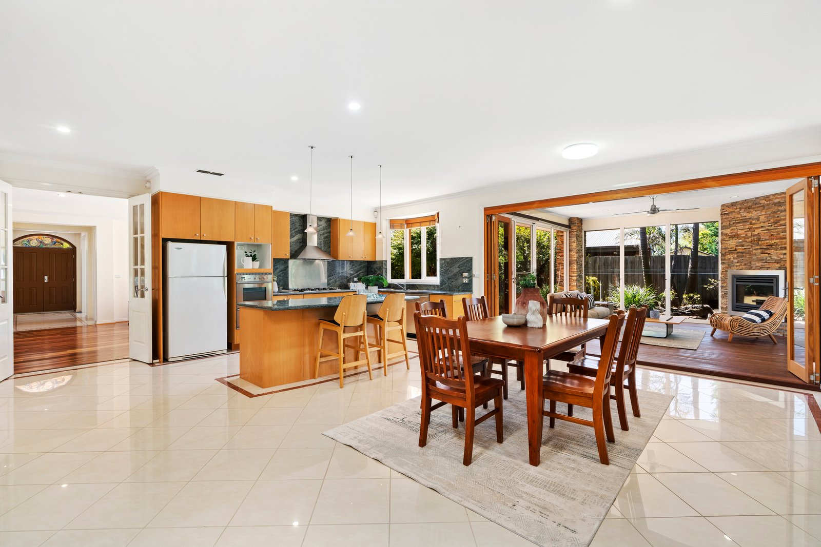 Family living unfolds across a Spotted Gum family room, a tiled dining hall and a private corner rumpus....
