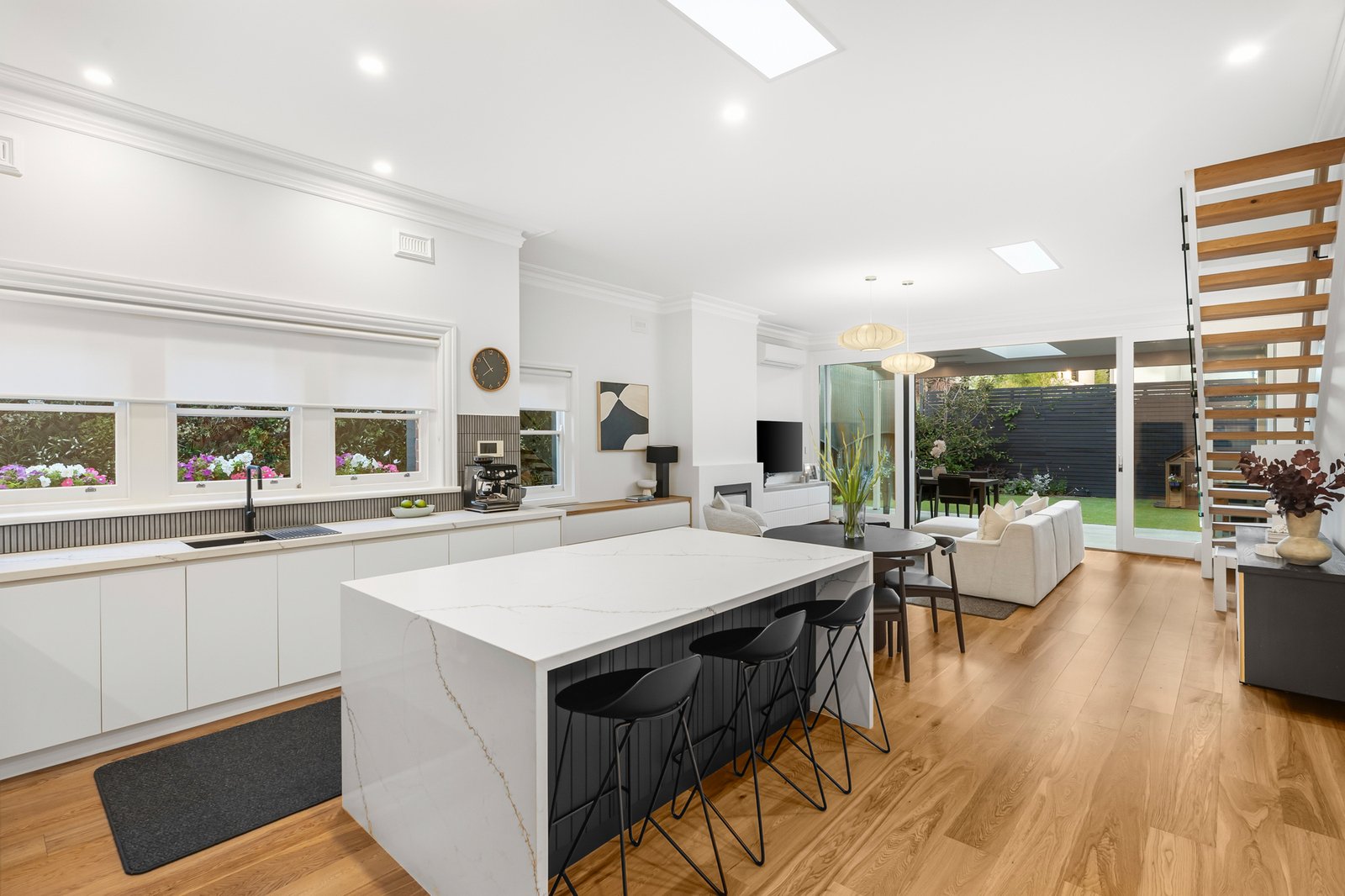 Elegant, expansive and enviably located, this stunning Edwardian residence seamlessly blends timeless character with modern comfort to create a light-filled coastal sanctuary in the heart of Elwood’s Golden Mile. Thoughtfully designed across a flexible dual-level layout, the home delivers generous proportions, family functionality and effortless indoor/outdoor connection within one of the area’s most coveted beachside settings. Beyond a secure picket fence, a welcoming entry reveals a privately positioned ground-floor main bedroom complete with walk-in robe and ensuite, complemented by a full laundry/powder room for everyday convenience. The home then unfolds into an expansive open-plan kitchen, dining and living domain of impressive scale, flowing seamlessly to a sun-drenched rear alfresco perfect for relaxed family living and vibrant entertaining. Upstairs, two additional bedrooms with built-in robes are served by a central bathroom and accompanied by a spacious rumpus or retreat, providing ideal separation for children, guests or working from home. Established gardens, a rear alfresco zone, storage shed and secure carport complete the picture of practical comfort and lifestyle ease. Perfectly positioned moments from Elsternwick Park, Elwood Village, Point Ormond Lookout and the beach, this exceptional residence delivers enduring charm, considered design and superb coastal liveability.
