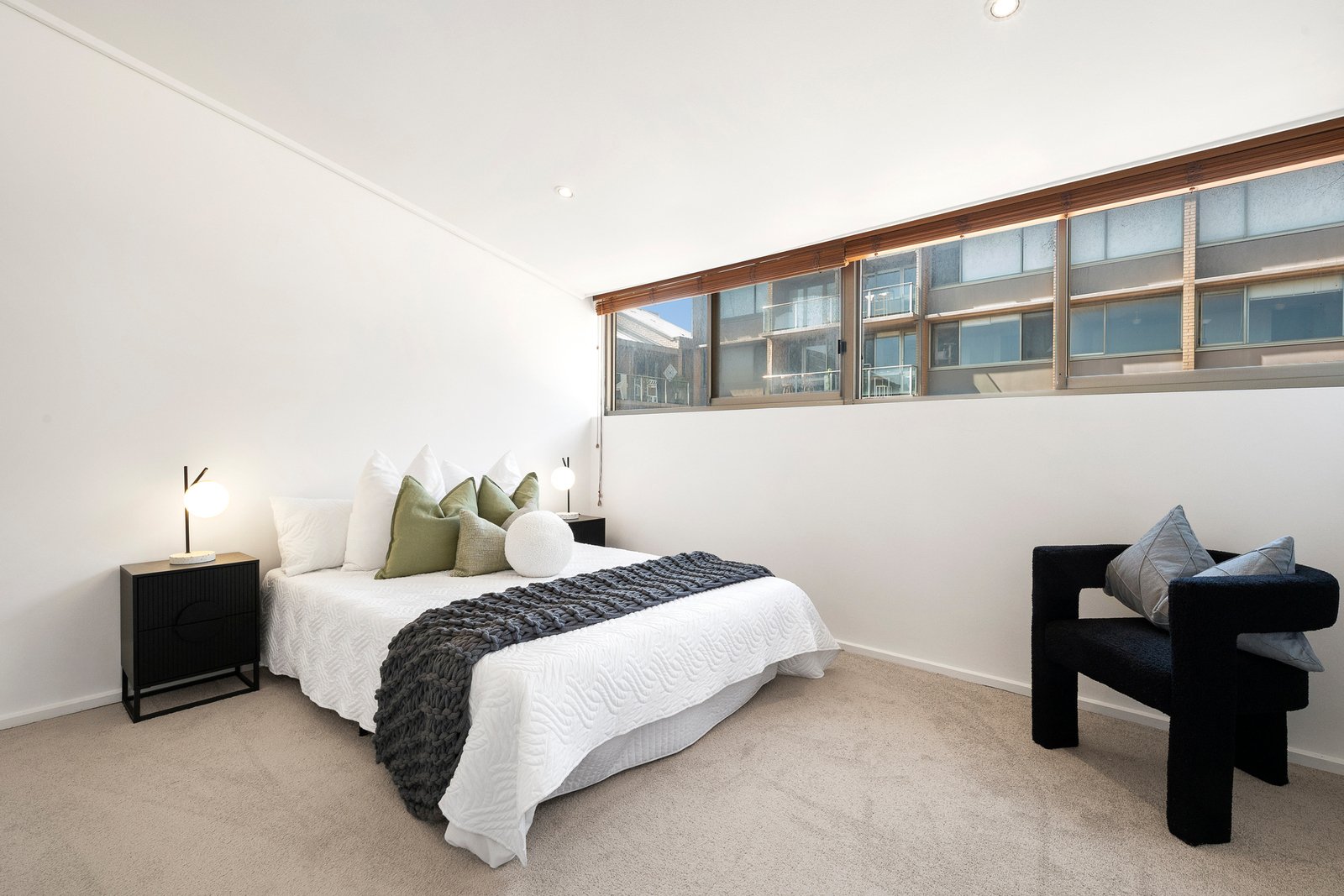 Showcasing the impressive space on offer, a raked-ceiling upper master enjoys a smart ensuite, mirrored robe, clerestory windows, and views across parkland to the bay beyond, while a central bathroom with a separate WC joins extensive robe space in serving a sizeable guest room. Wonderful as a shaded retreat for an afternoon with a novel, an additional back courtyard headlines a long list of further highlights, accompanied by reverse-cycle heating/cooling, scattered skylights, stone-top vanities, a downstairs powder room, full-size laundry, alarm, video intercom, two secure car spaces and a basement storage cage, and access to the building’s feature pool.
