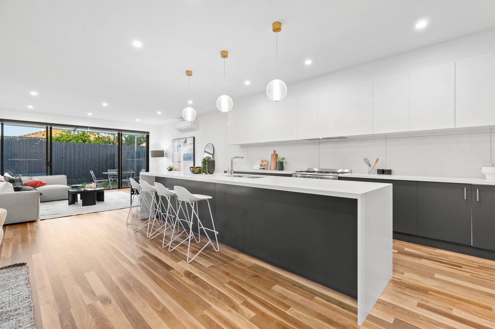 Thoughtfully zoned, it features a quiet lounge overlooking a sunlit central courtyard, while expansive north-facing living and dining flow seamlessly to a covered alfresco deck. An upstairs bedroom level offers privacy and calm, highlighted by a discreet master wing, while the prestige kitchen impresses with stone benchtops, quality appliances and an oversized island ideal for hosting.