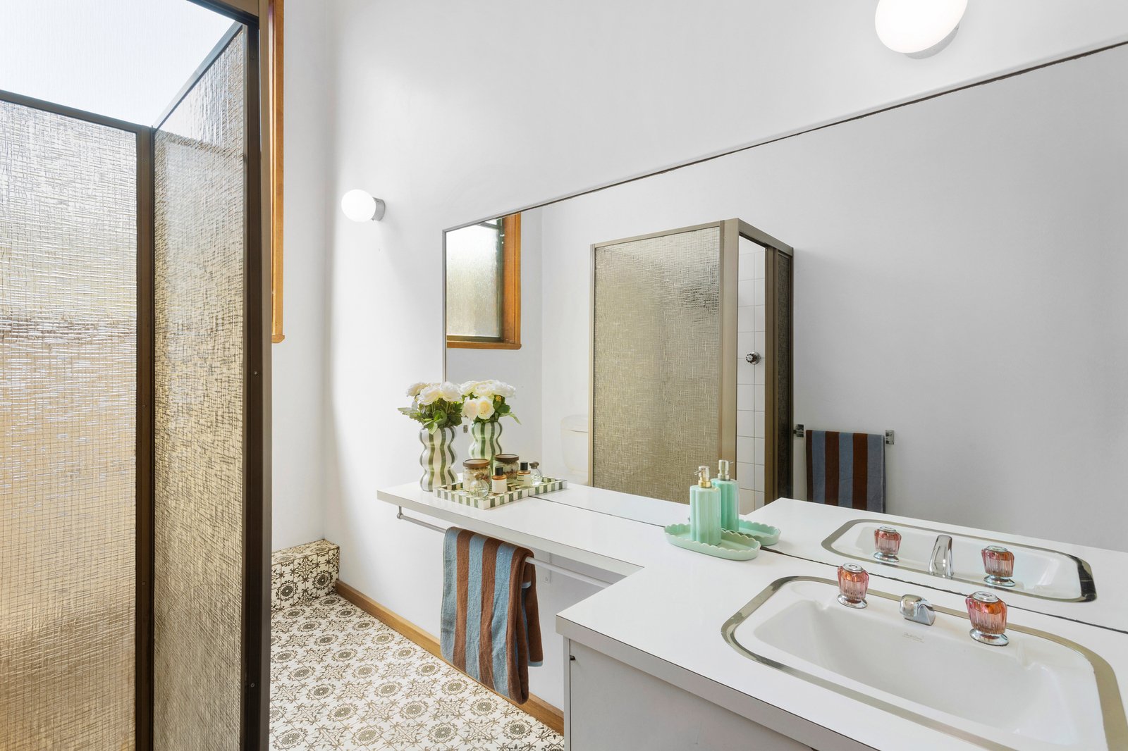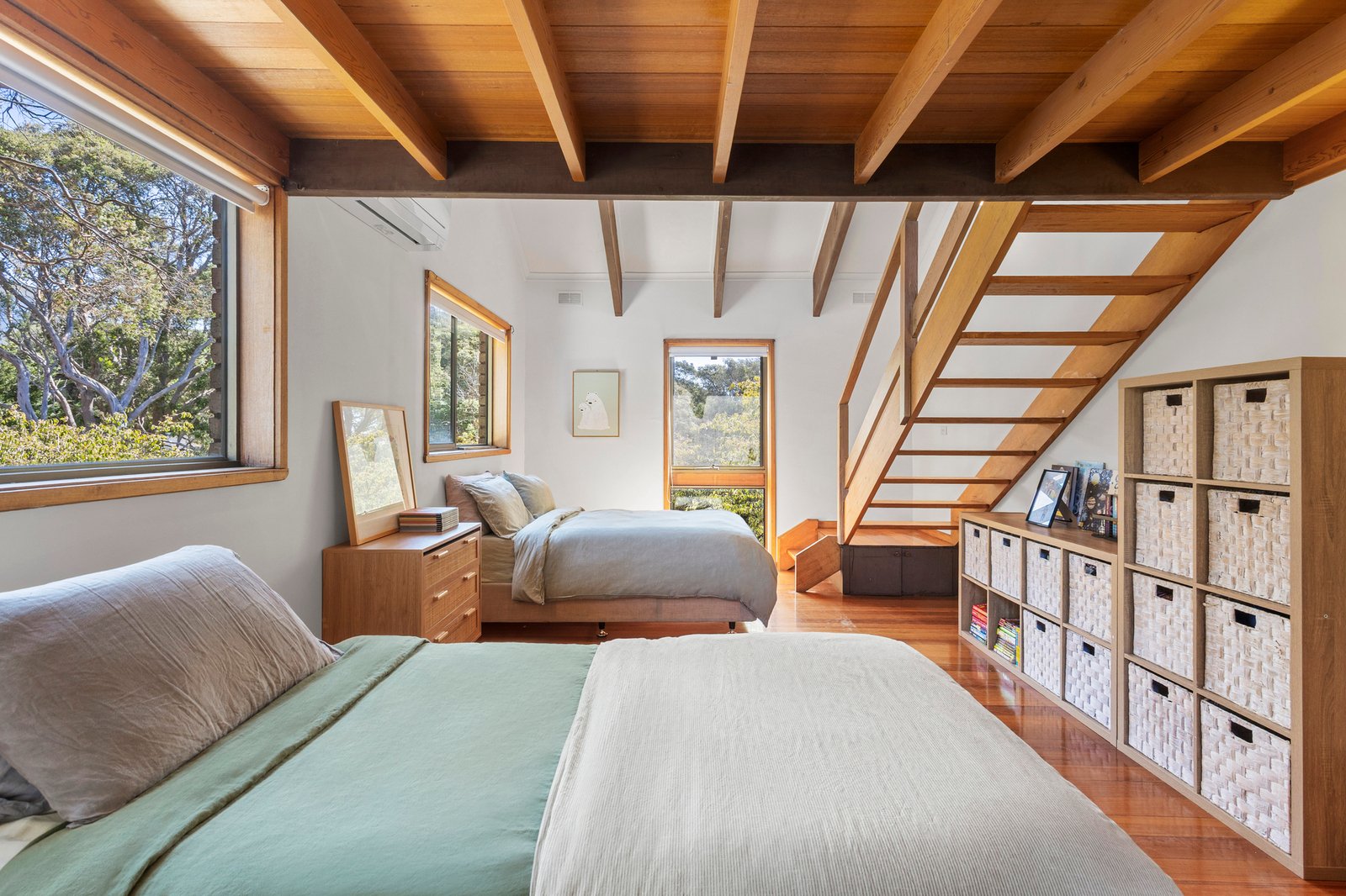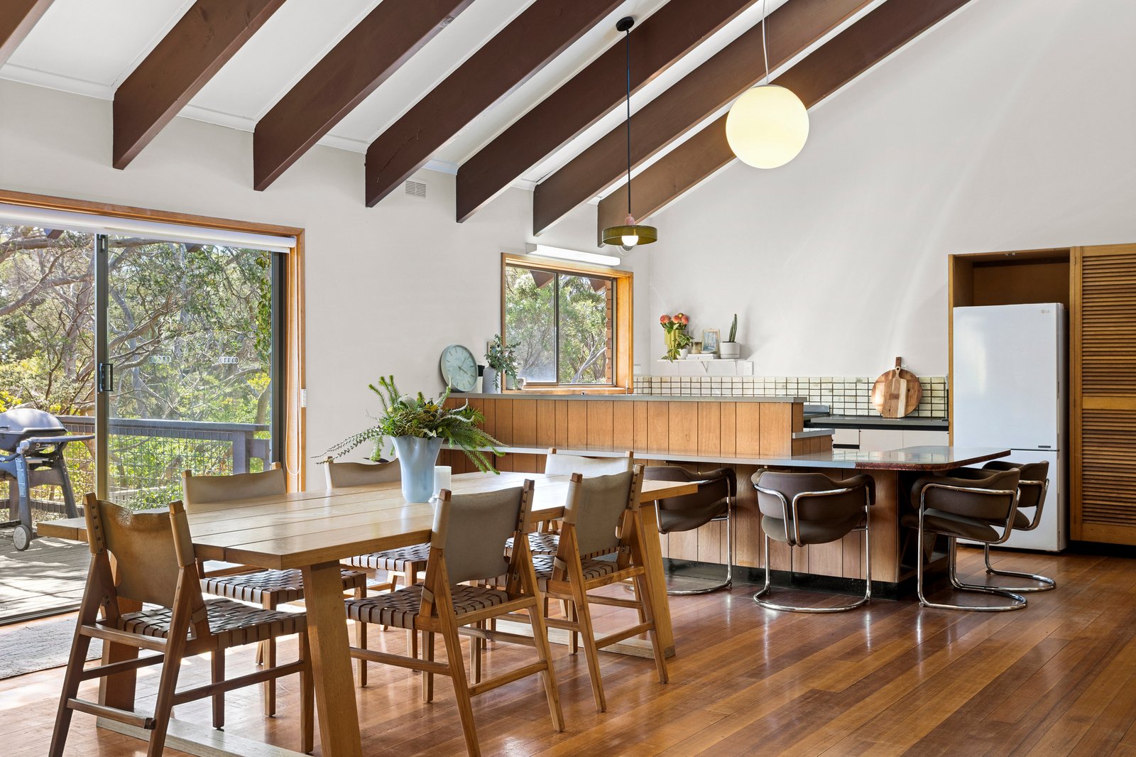 Elevated above expansive native gardens, it is wrapped by timber decks and draws light and treed outlooks through every room. Soaring vaulted ceilings with exposed beams and highlight windows add extraordinary height to the already generous proportions, accentuated by polished hardwood floors and oversized glazing. Open-plan living and dining areas open to the al-fresco deck, whilst the kitchen provides an immaculate social hub, prime for a first-class renovation.