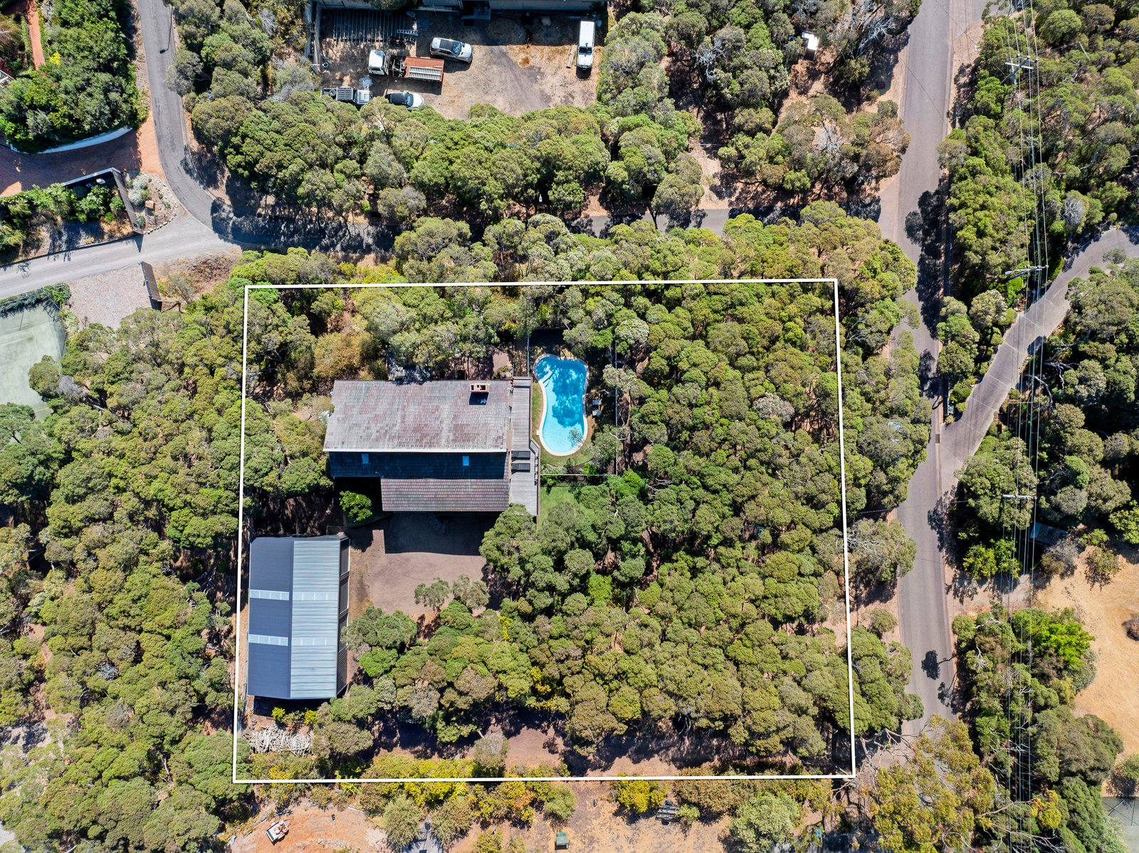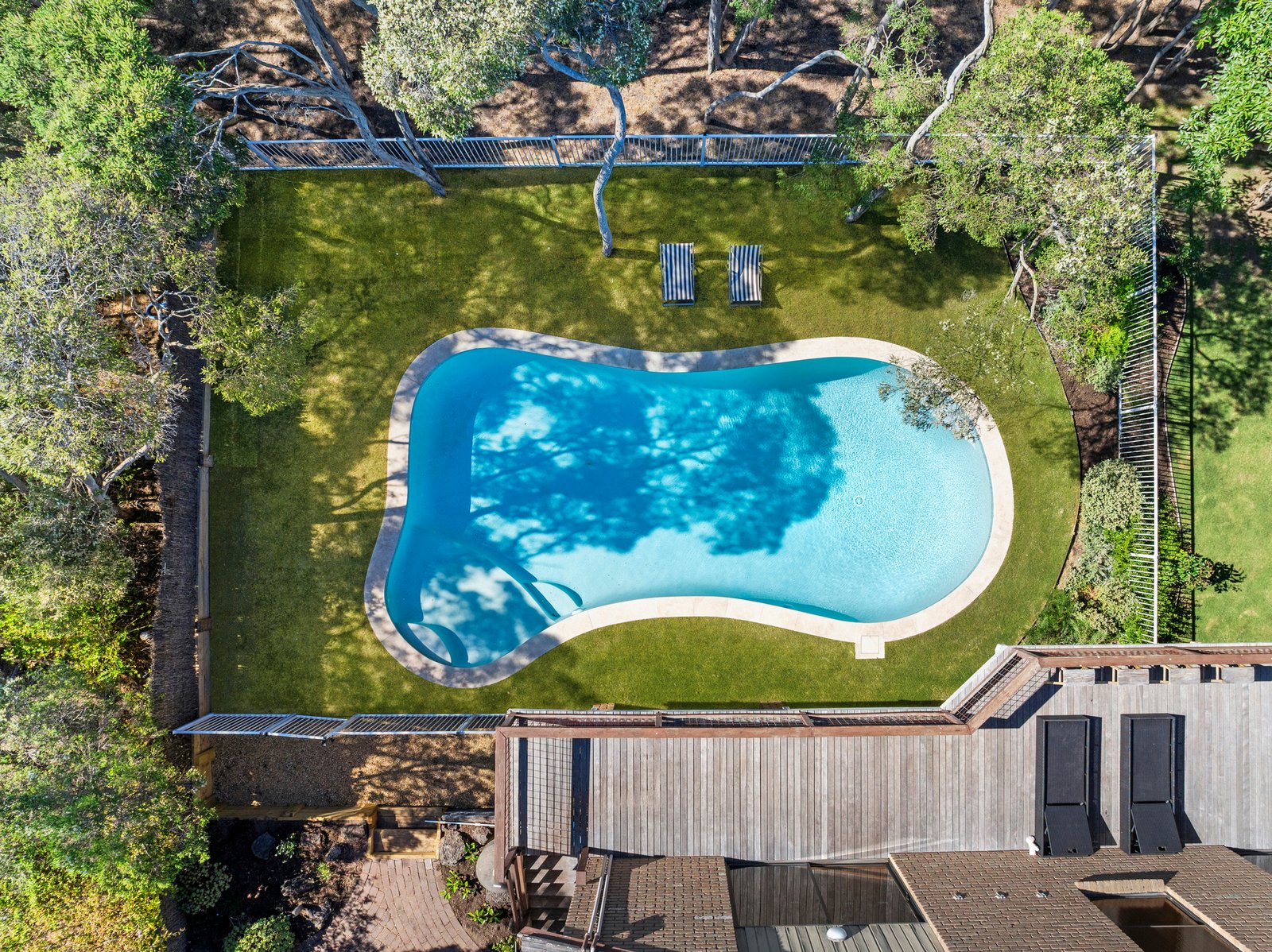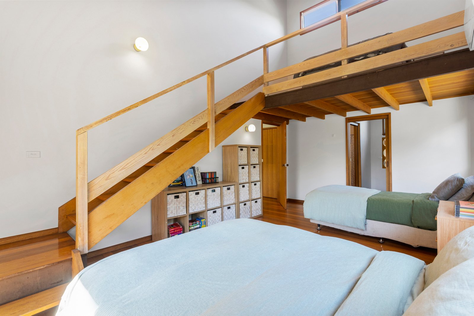 A separate family room with a wood fireplace also connects to the outdoors, stepping out onto the northern terrace, which takes in the tree-top beauty above and the fully refurbished pool below, where the setting is sensationally private, shielded by mature landscaping and surrounded by nothing but birdsong and canopy. Three bedrooms and two bathrooms provide excellent flexibility, with one featuring a spacious mezzanine loft, an option as a fourth and semi-ensuite access, ideal as a study, play area, or future main suite, whilst amenities include an enormous three-bay concrete floored high – access shed, under-house double garage, laundry, storage areas, and split system heating and cooling.