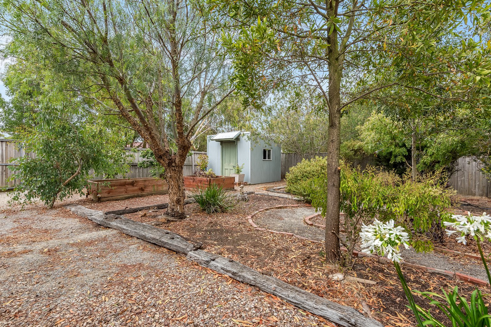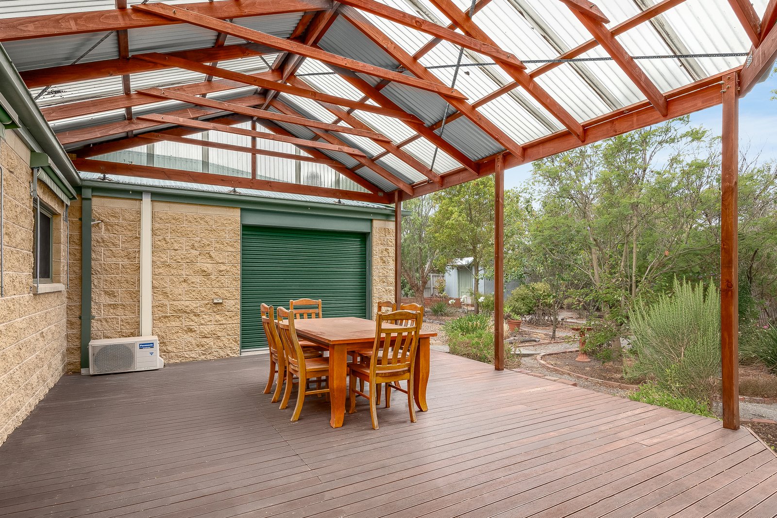 Outside, the large undercover alfresco deck offers a private and sheltered space to relax or wine and dine outdoors. The landscaped gardens feature an array of established trees, creating a lush and tranquil environment, with raised veggie beds ready for your own home grown produce. A garden shed provides practical outdoor storage, while a rainwater tank supports easy upkeep. The double garage includes undercover verandah access to the home, along with a rear roller door opening to the alfresco for added functionality.