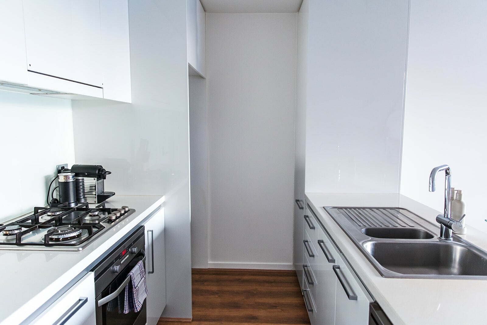 Contemporary kitchen with stone benchtops & stainless steel appliances including dishwasher & gas cooktop