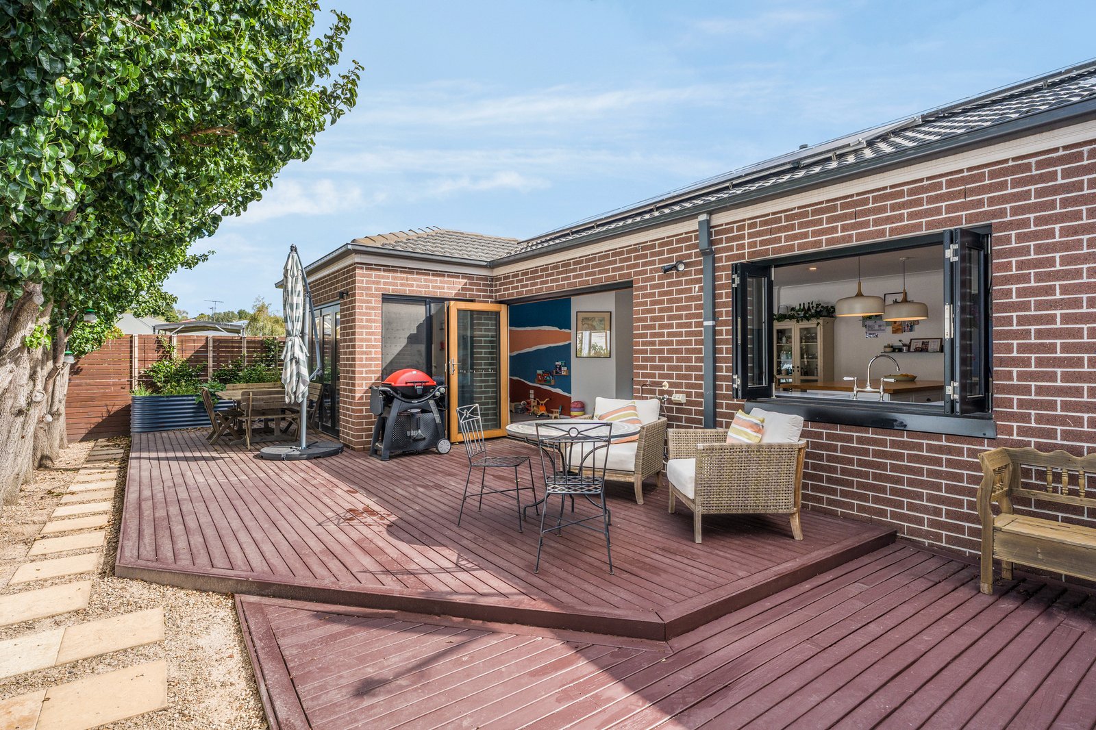 Outdoors, the property continues to impress with raised garden beds, low maintenance landscaping, an integrated irrigation system, and decked entertaining areas accessed via bifold doors and windows, enhancing the indoor/outdoor connection.