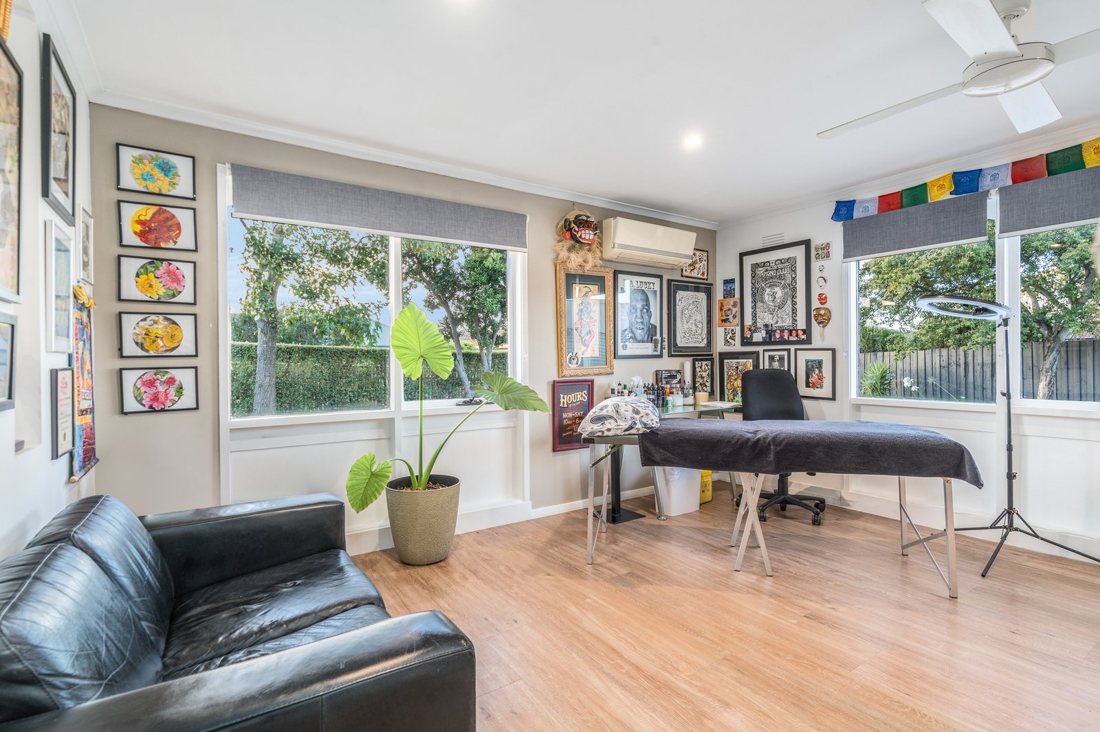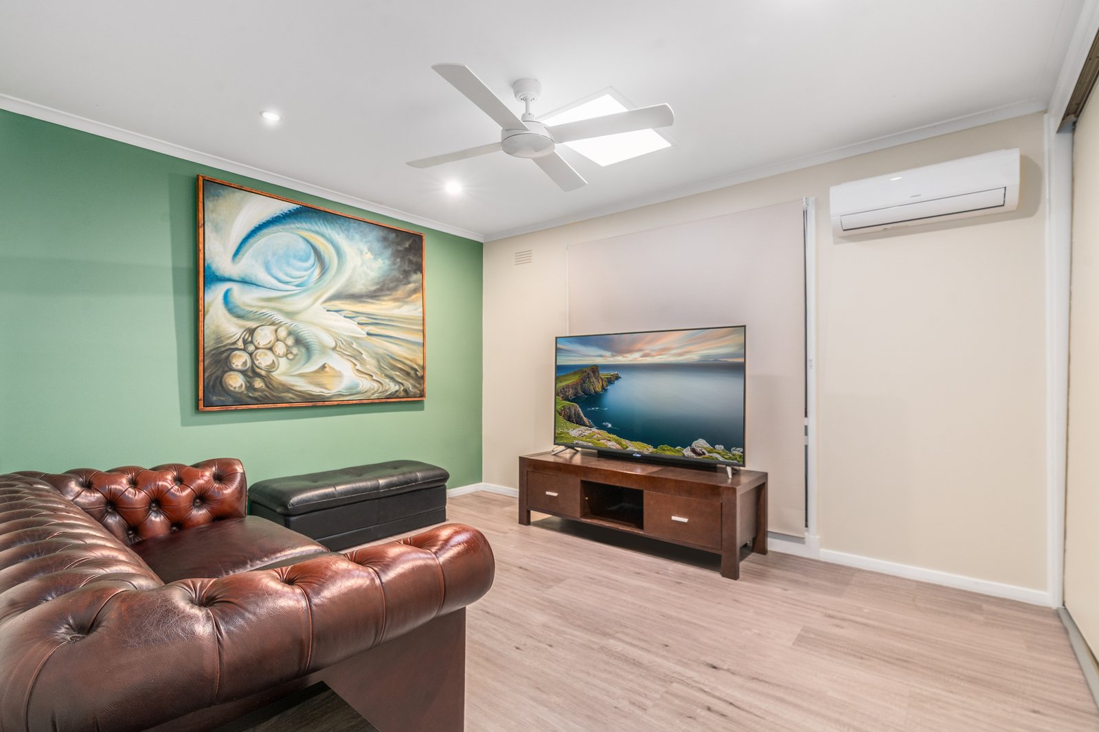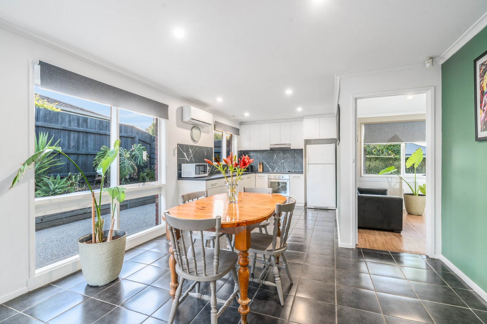 Designed with practicality in mind, the home offers three spacious bedrooms, all serviced by a central bathroom, along with a large light-filled living zone perfect for relaxing or entertaining. A separate kitchen features stainless steel 600mm oven, electric cooktop and rangehood, with an adjacent dining area for everyday functionality. Timber laminate flooring and tiles throughout create a low-allergy, easy-care environment, complemented by three reverse-cycle split systems, ceiling fans, downlights and skylights to ensure year-round comfort and natural light.