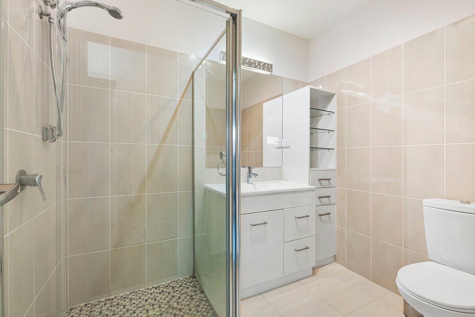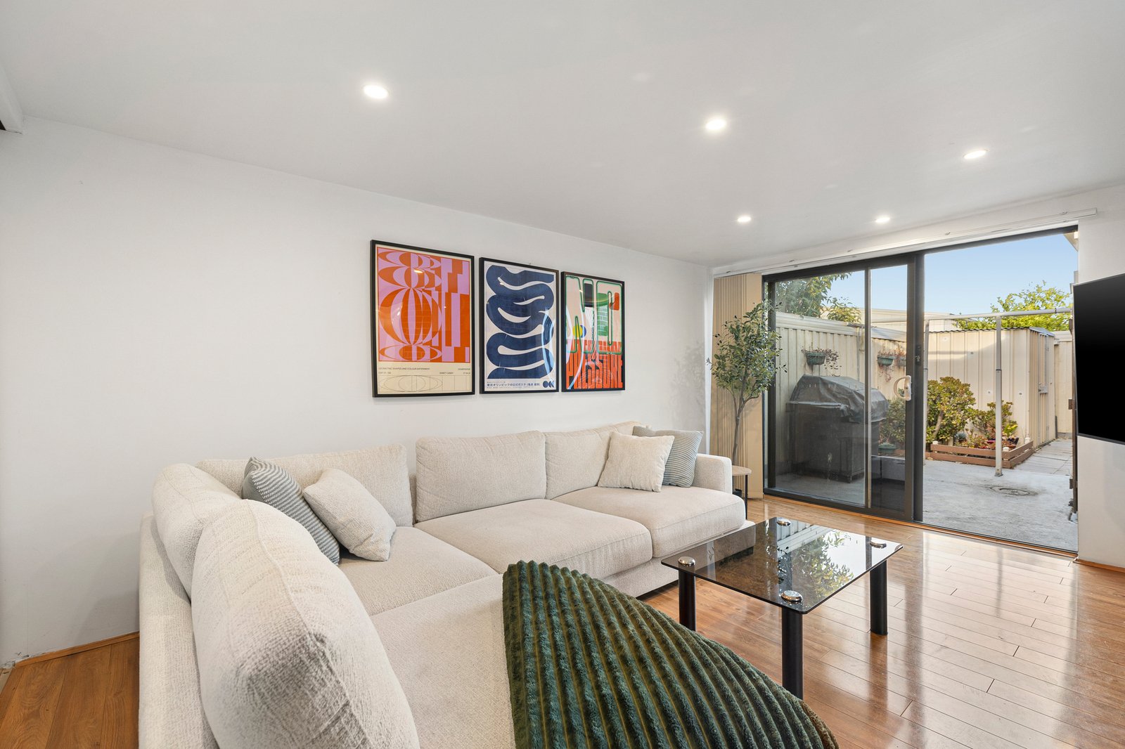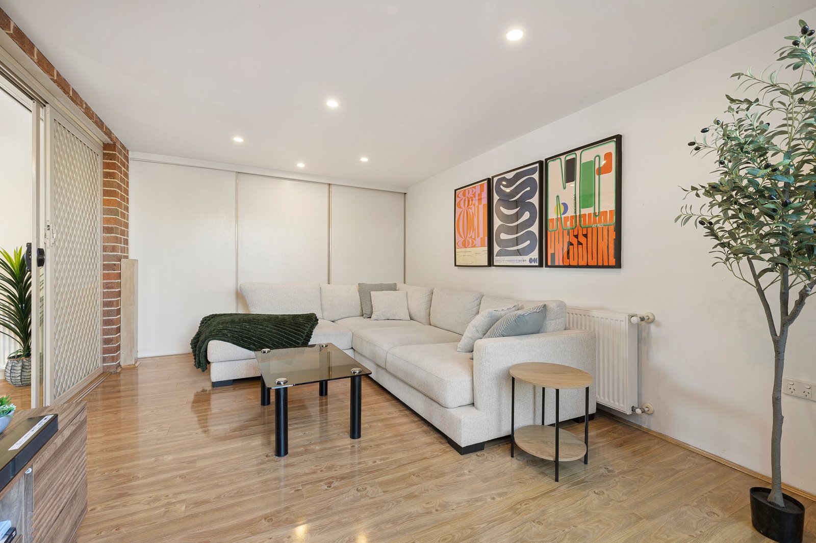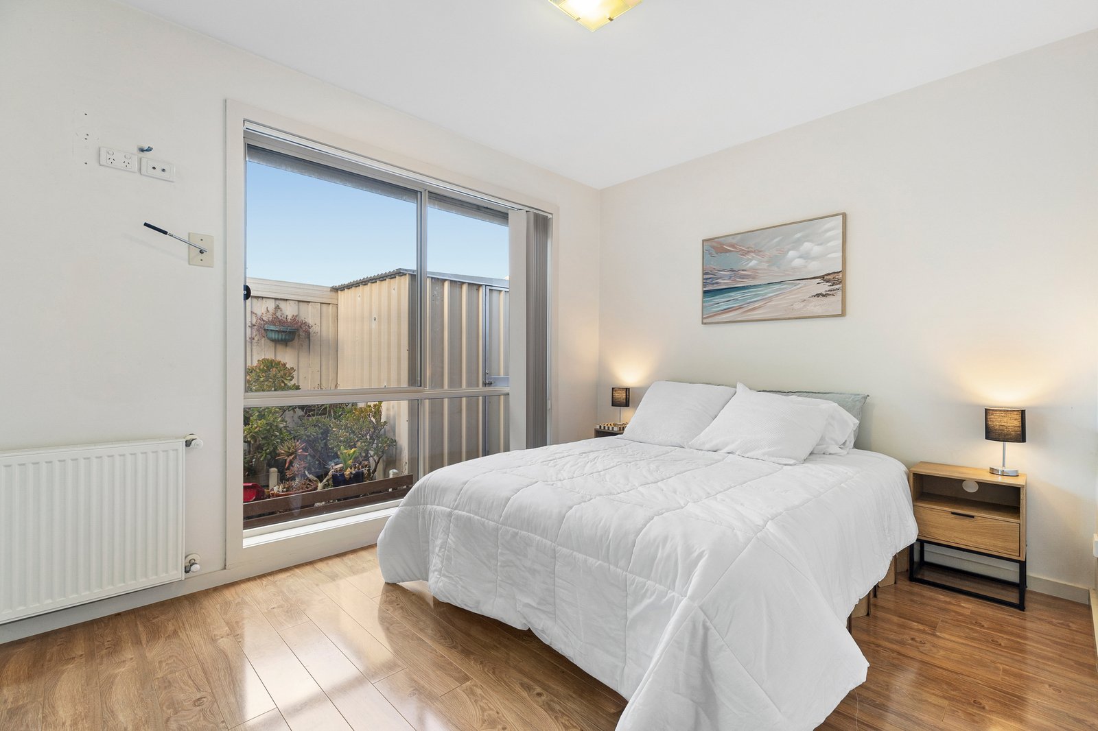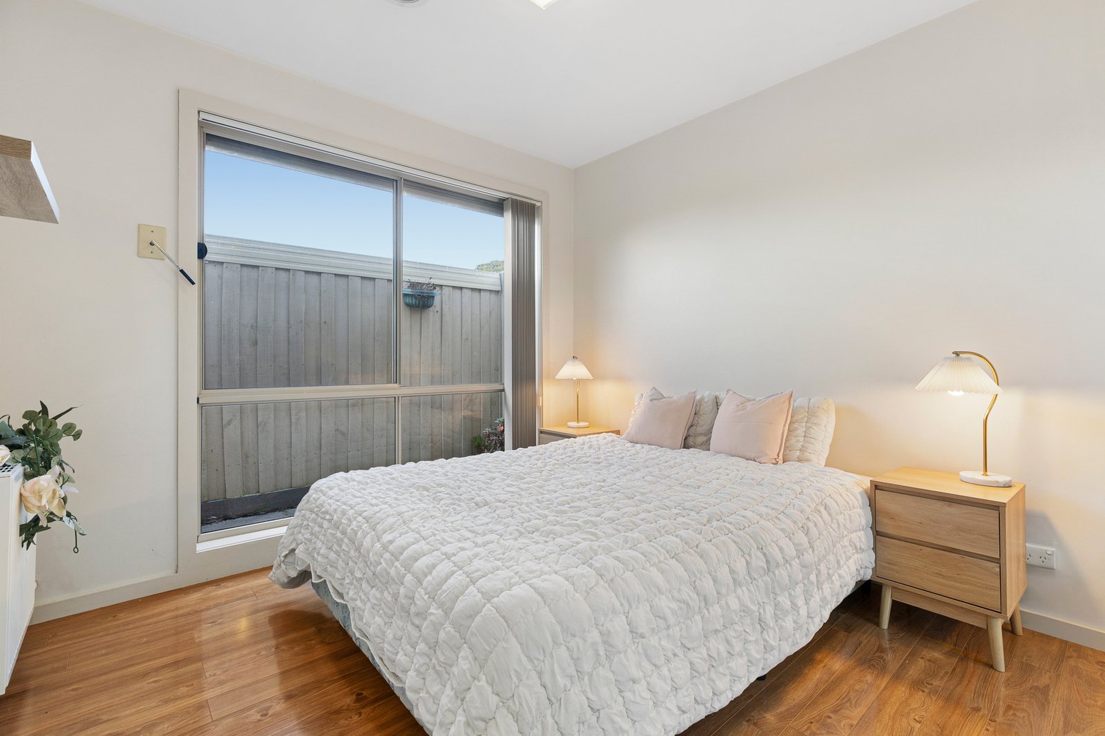 Two well-proportioned bedrooms include built-in robes and are serviced by a central bathroom with excellent storage and a full-sized shower. Hydronic heating throughout, air conditioning, roller shutters and heaters in every room ensure year-round comfort and security.