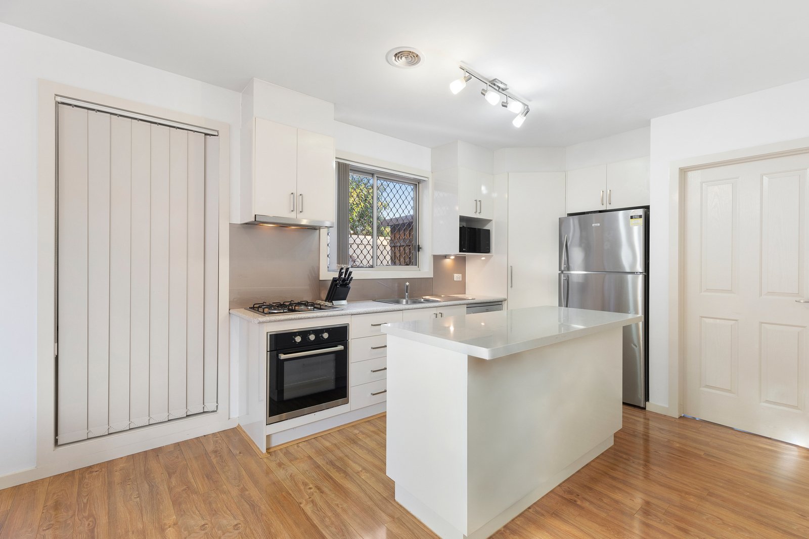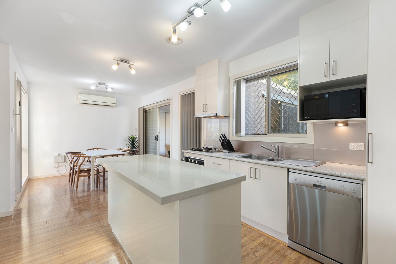 At the centre, a light-filled kitchen and meals zone anchors the home, designed for everyday ease and connection. The kitchen features a generous island bench, tiled splashback, large pantry and quality appliances, with the dining area bathed in natural light. Separate and spacious, the living room enjoys sliding door access to the low-maintenance courtyard, ideal for relaxed entertaining or quiet afternoons outdoors.
