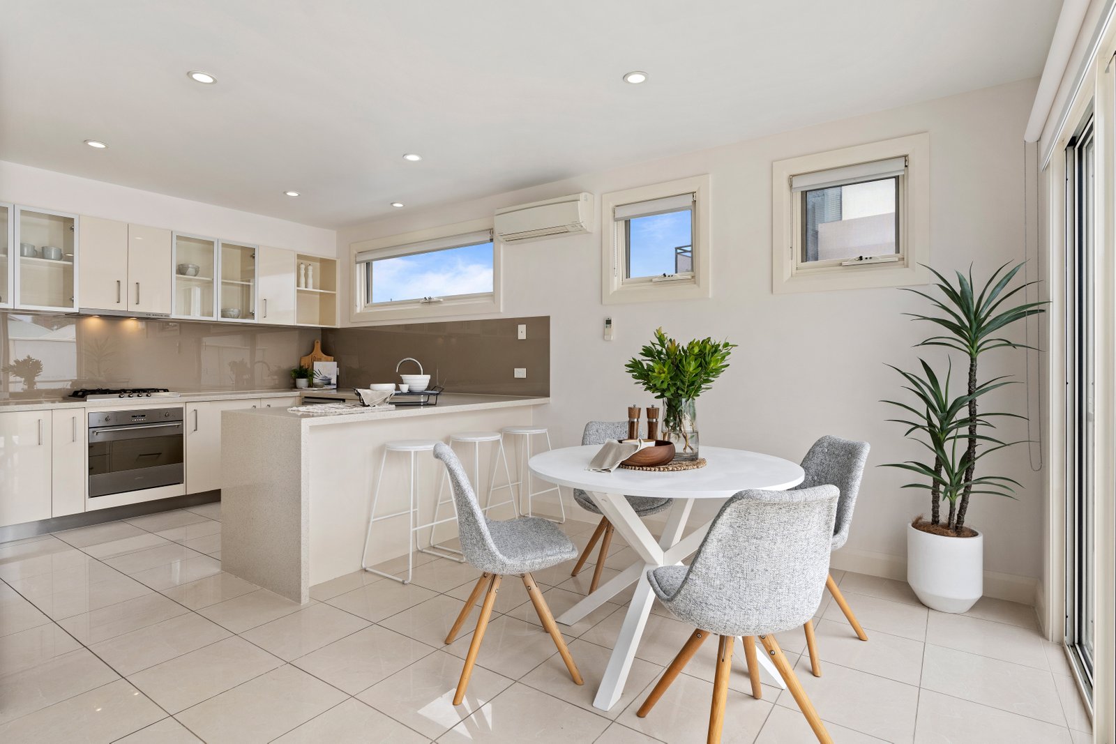 - Open plan kitchen/living area with stone benchtops and stainless steel appliances