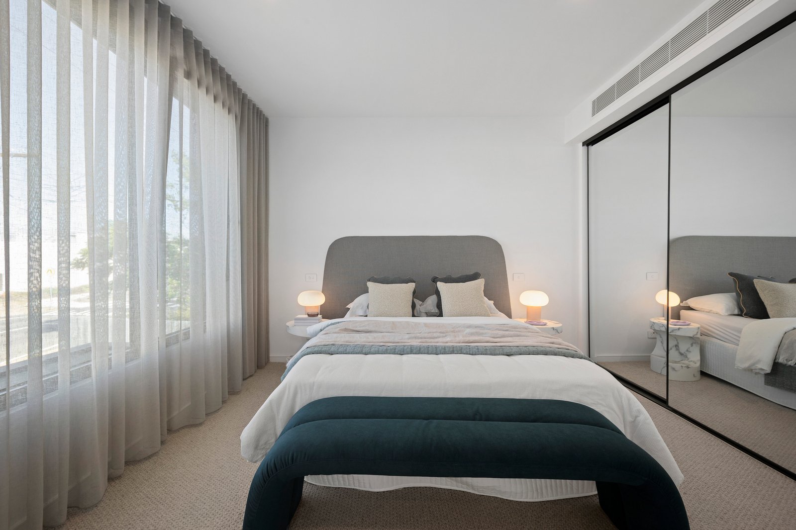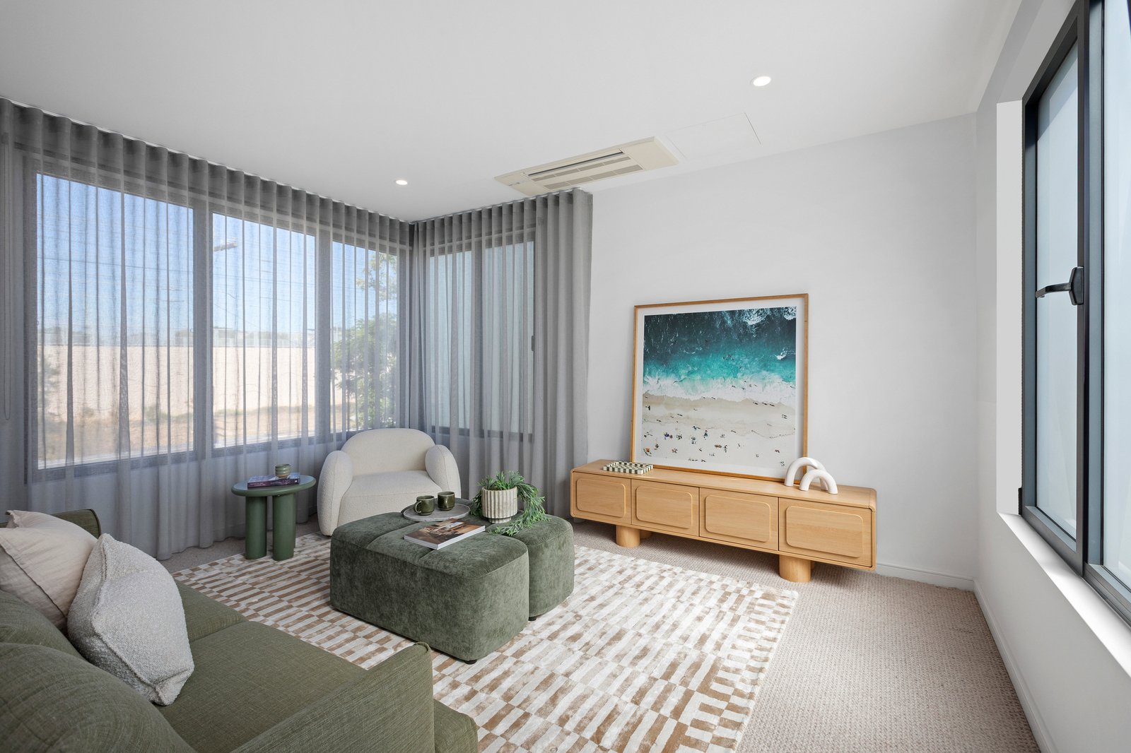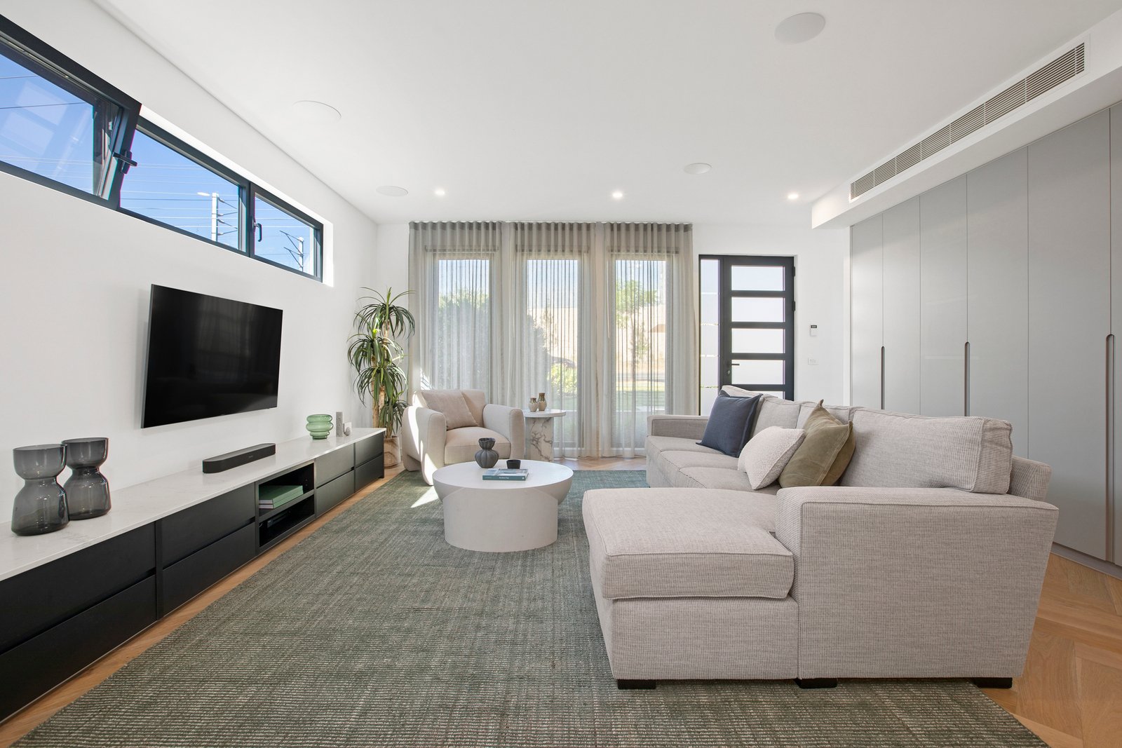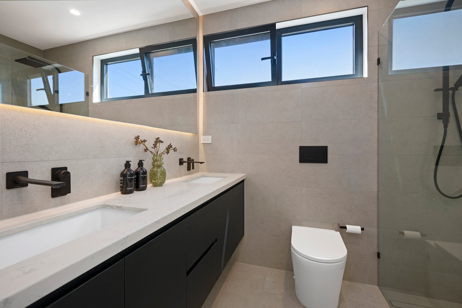 A striking central bathroom with full-height tiling and matte black tapware services the additional bedrooms, while a ground-floor powder room adds further convenience. Enhancing the home’s comfort and functionality are a dedicated first-floor retreat or study, individually controlled refrigerated heating and cooling to all main rooms, ducted vacuuming, integrated CCTV and alarm system, a whole-home sound system with external speakers, LED halo mirrors and double-glazed European tilt-and-turn windows. Acoustic plaster and insulation to the front of the home ensure exceptional sound insulation.