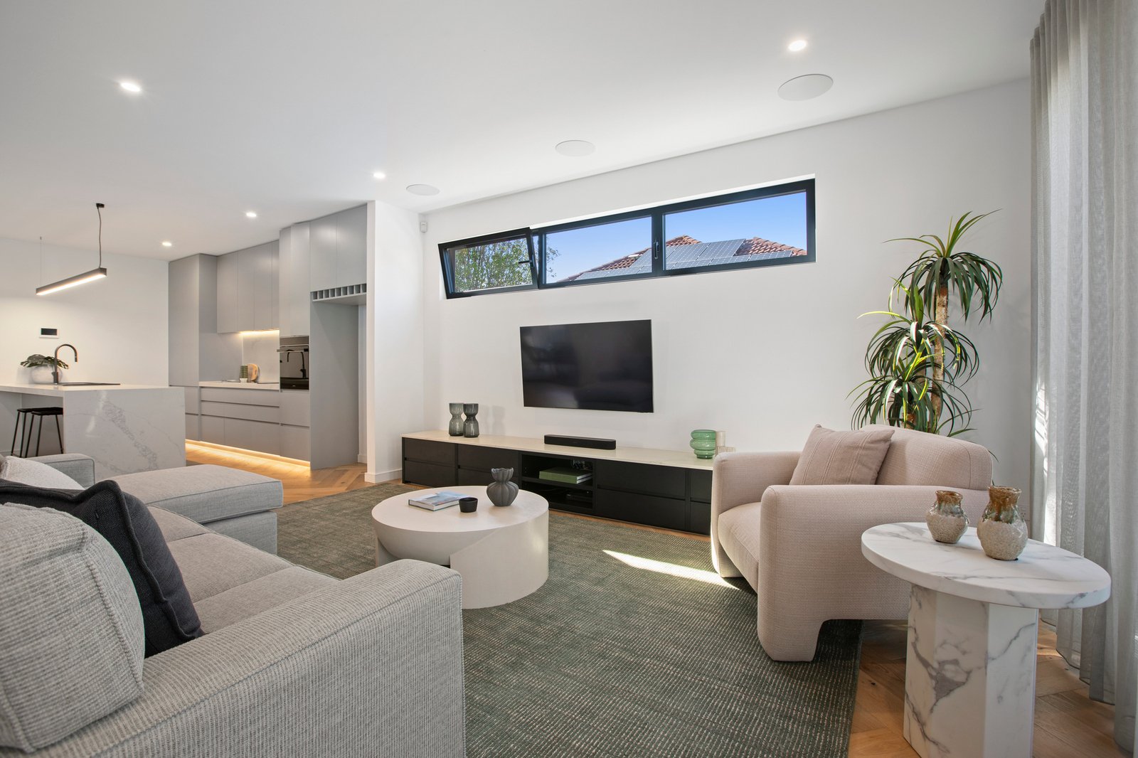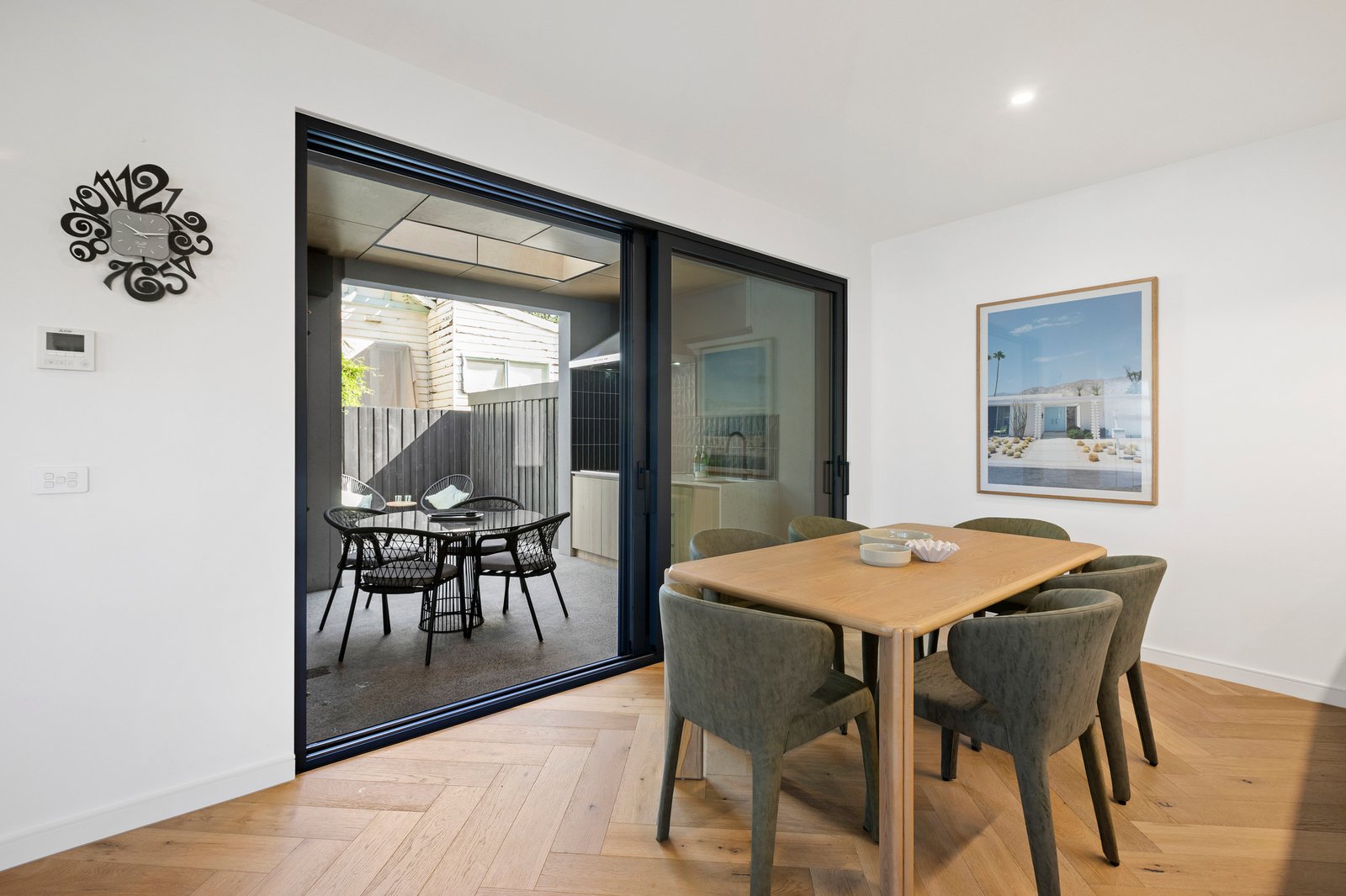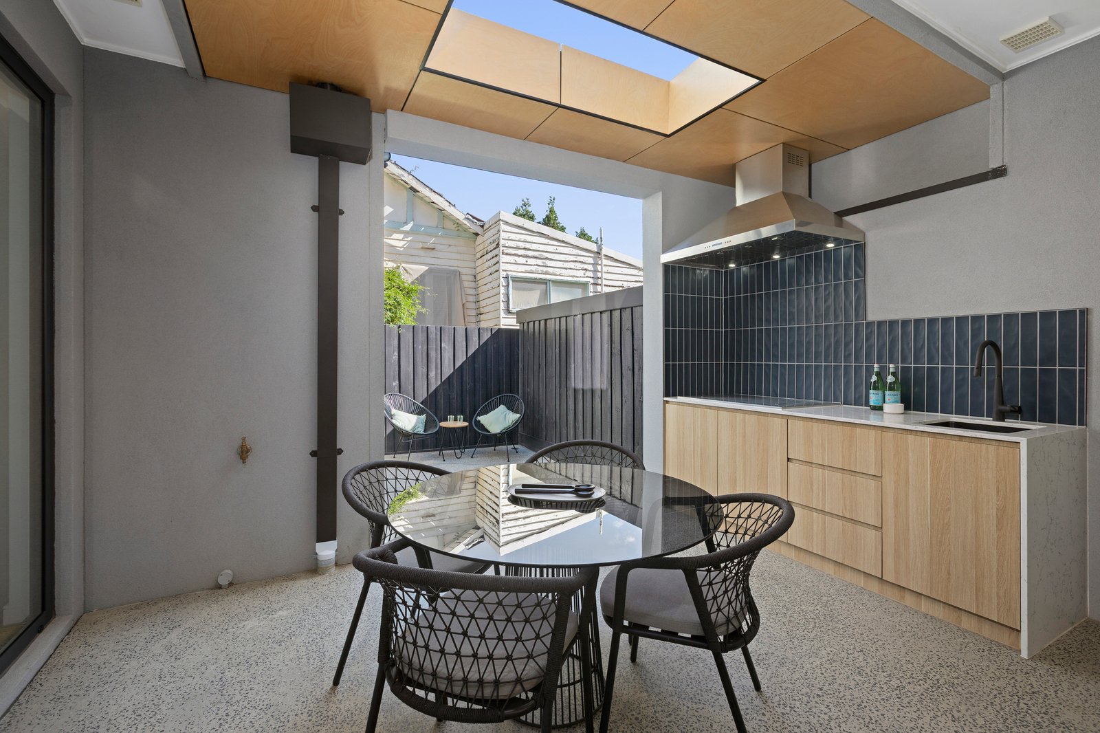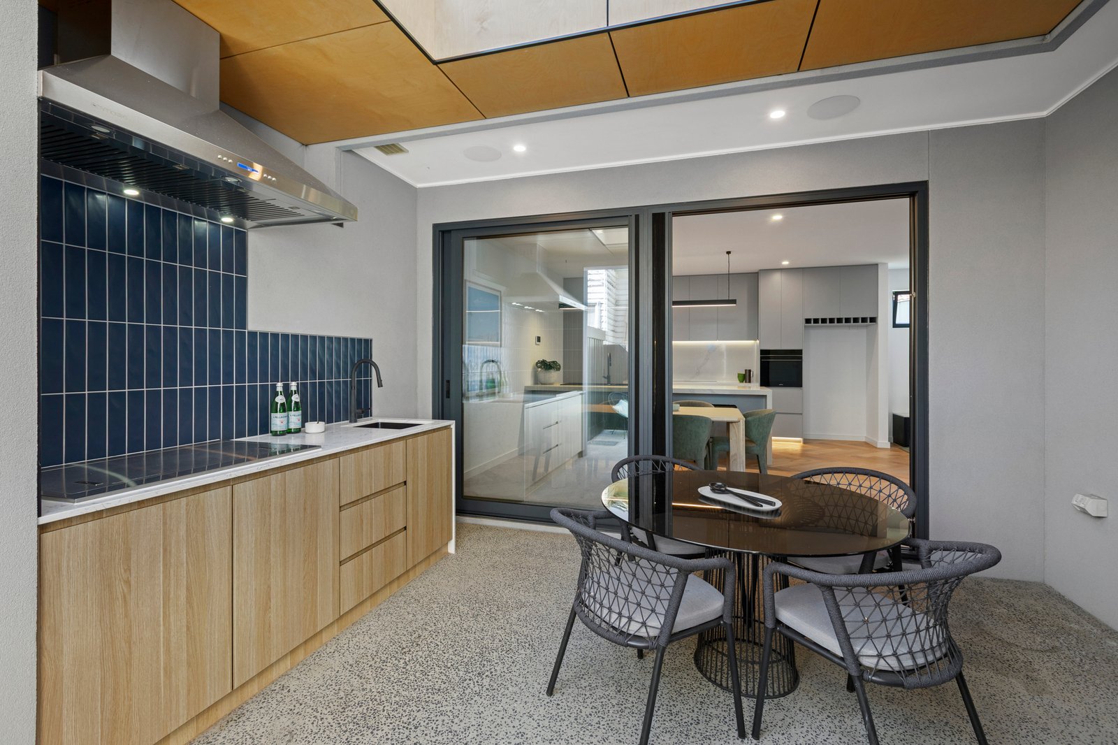 Sliding doors extend the living space outdoors to a secluded alfresco zone, thoughtfully equipped with an outdoor kitchen and designed for effortless hosting through the warmer months.