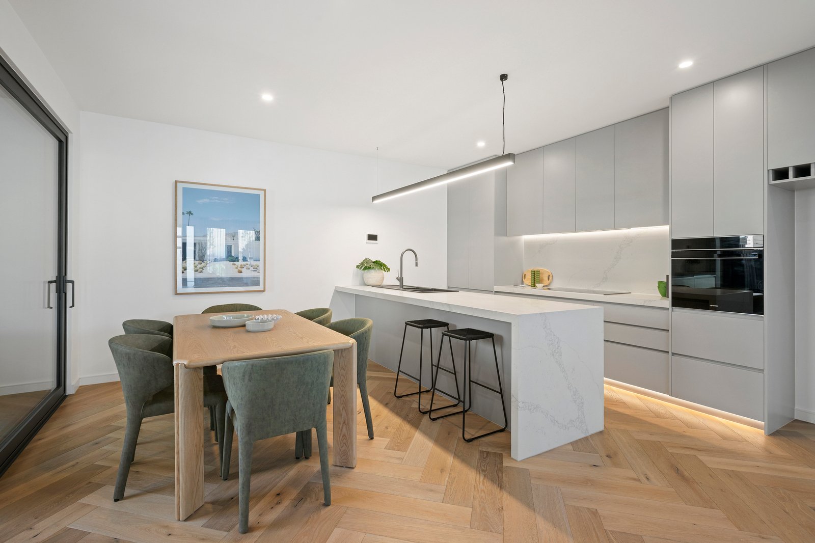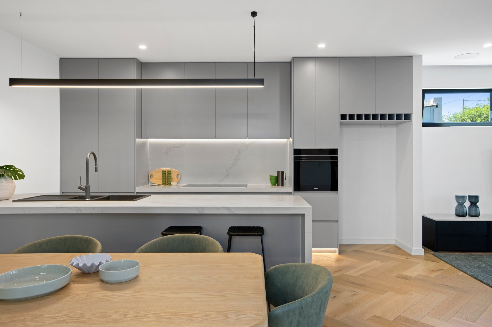 The home makes a striking first impression with its contemporary façade and manicured gardens, before revealing beautifully curated interiors that feel both elegant and welcoming. Herringbone timber flooring anchors the ground floor, where light-filled open-plan living and dining spaces are enhanced by custom joinery and statement stone features. At the heart of the home, the designer Epicurean kitchen is a true showpiece, showcasing impressive 60mm stone benchtops and high-end Dolce Novo Smeg appliances, perfectly suited to both everyday living and entertaining.