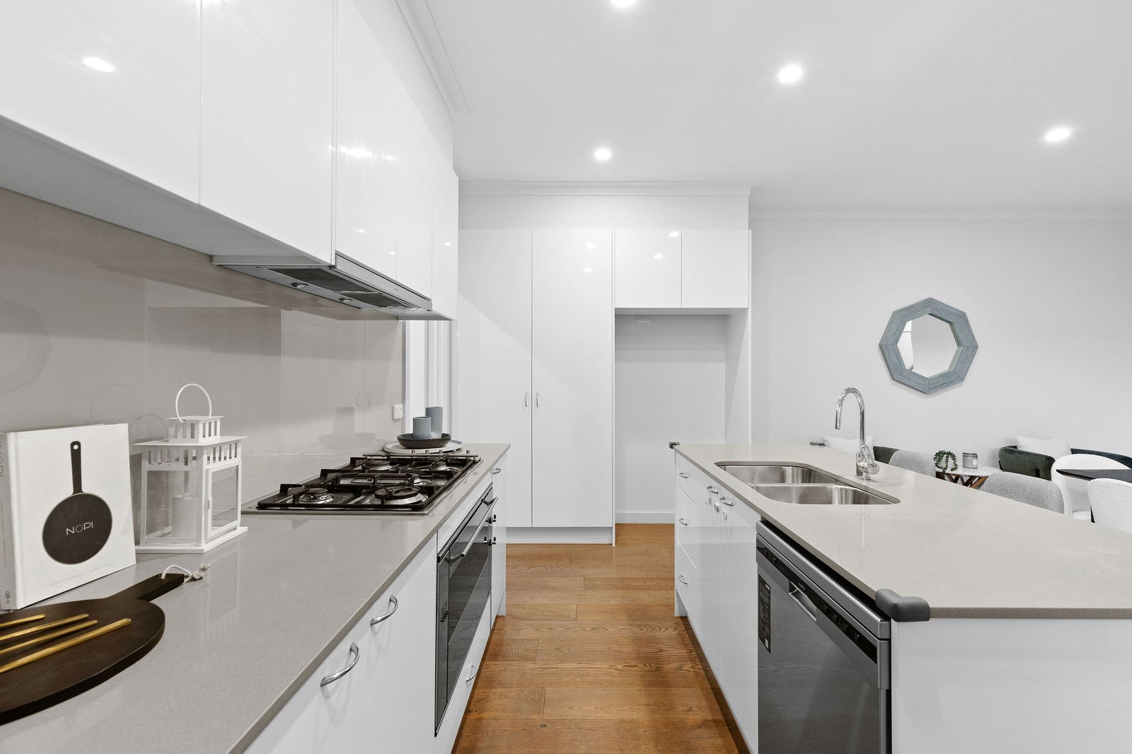 At the heart of the home, the contemporary kitchen showcases stone benchtops and quality appliances, thoughtfully designed to balance style with practicality while connecting effortlessly to the main living areas.