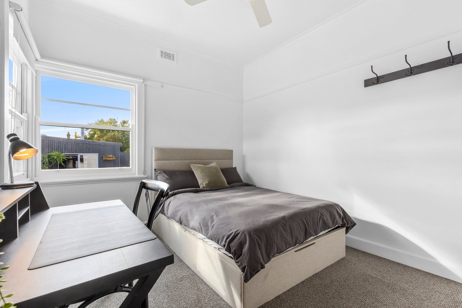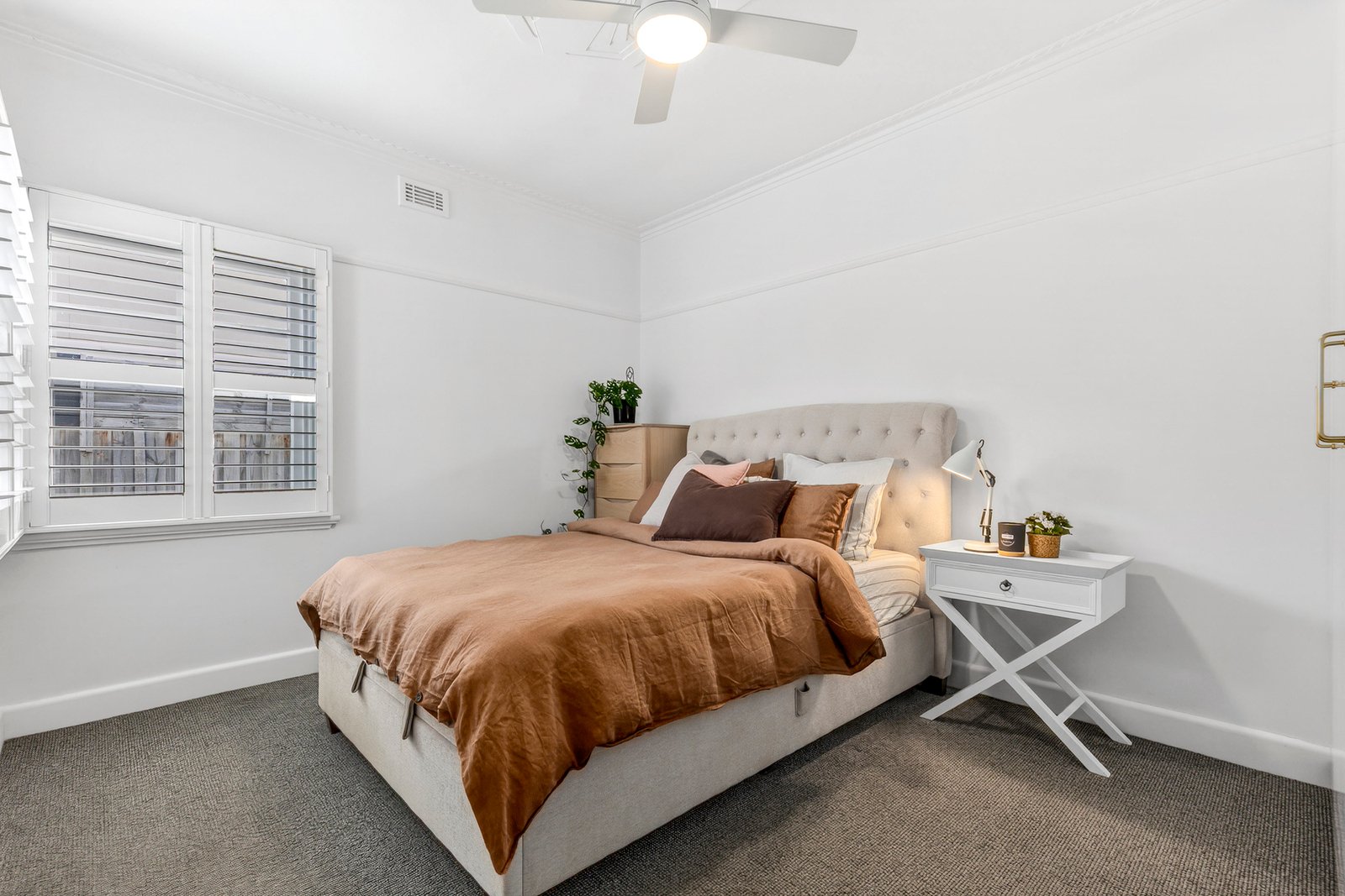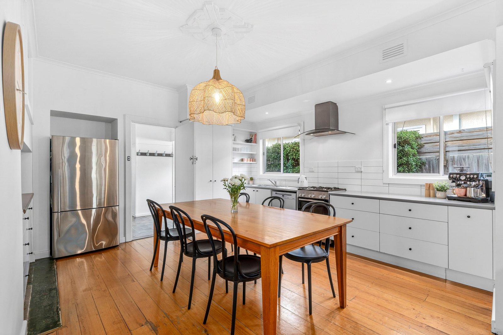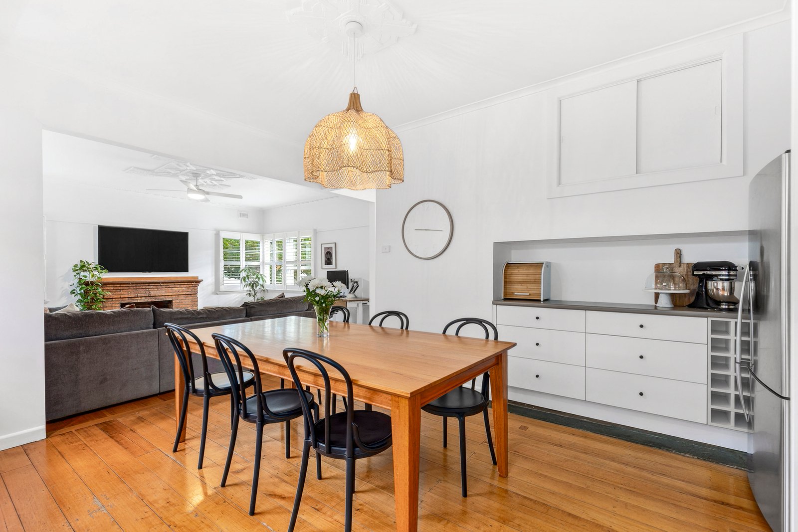 Nestled behind manicured hedges and established trees, the charming façade offers a warm welcome on arrival. Inside, beautifully preserved original features include polished timber floors, decorative cornice, picture rails, and stunning ornate ceiling detail. The inviting living area features a brick mantel and fireplace, classic plantation shutters, along with a ceiling fan plus split system heating and cooling for contemporary comfort. The open plan layout flows through the kitchen and dining space, equipped with quality appliances including a Bosch 600mm oven and cooktop, rangehood, Miele dishwasher, modern cabinetry, built-in wine storage and statement pendant lighting. Comprising three bedrooms, all include built-in robes and ceiling fans, serviced by a stylish central bathroom with heated towel rail, a modern vanity, and built-in linen storage. An additional wc and large laundry at the rear complete the well-functioning floorplan.