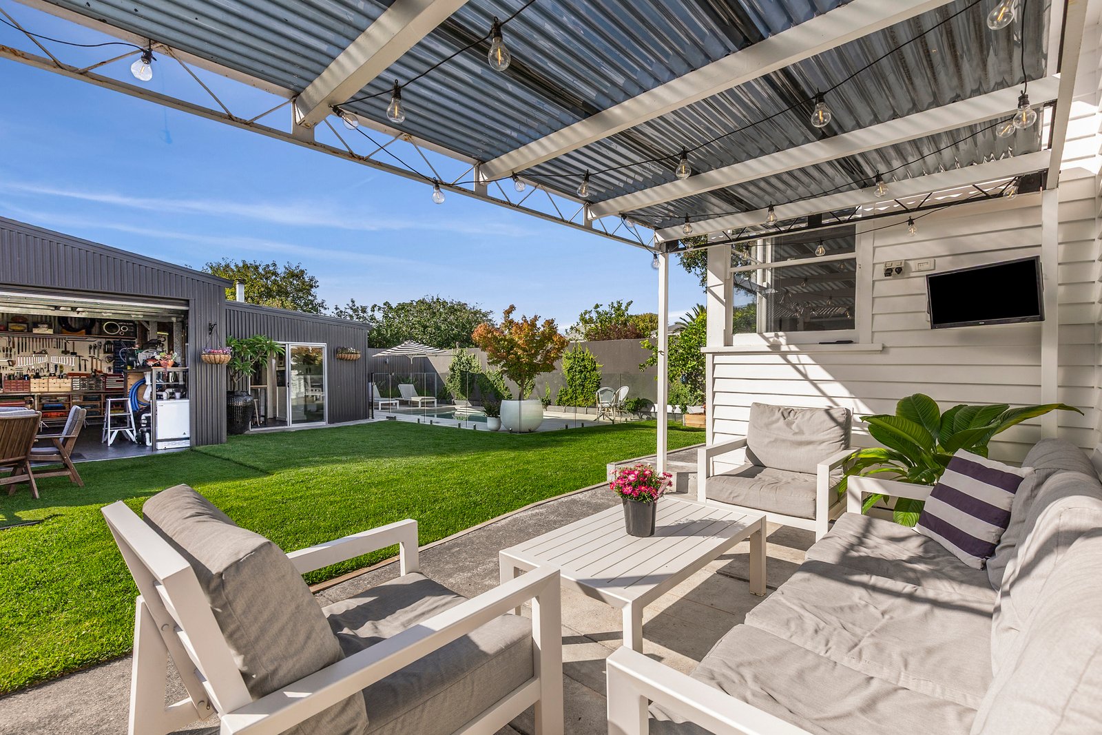 Outside, your private oasis awaits. A stunning in-ground solar-heated plunge pool is bordered by beautiful pavers and frameless glass fencing, with plenty of space for poolside lounging. A lush lawn area provides a secure space for the kids to play, adjoining an undercover alfresco that offers a sheltered spot for relaxing or entertaining. The oversized garage is an impressive multi-purpose space with both workshop and entertaining zones, a woodfire heater, bathroom facilities with shower, and a kitchenette, the perfect place to host large gatherings of family and friends all year round. A paved firepit area allows for cosy nights around the fire, and the long driveway accommodates ample off-street parking.
