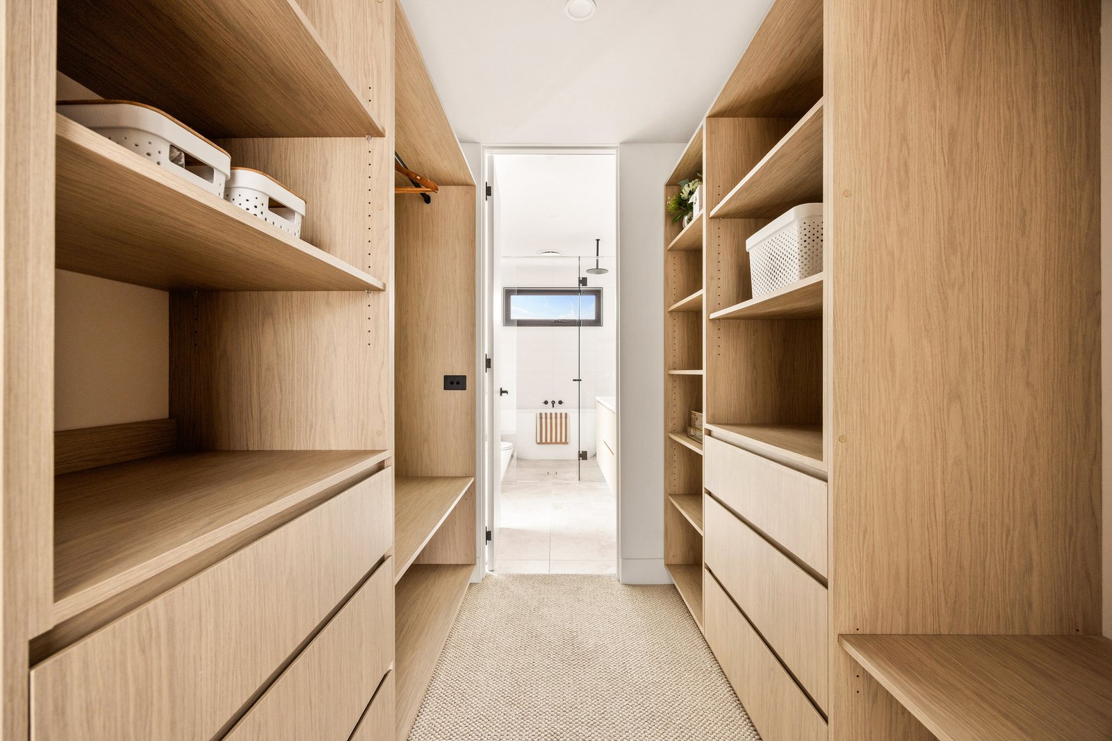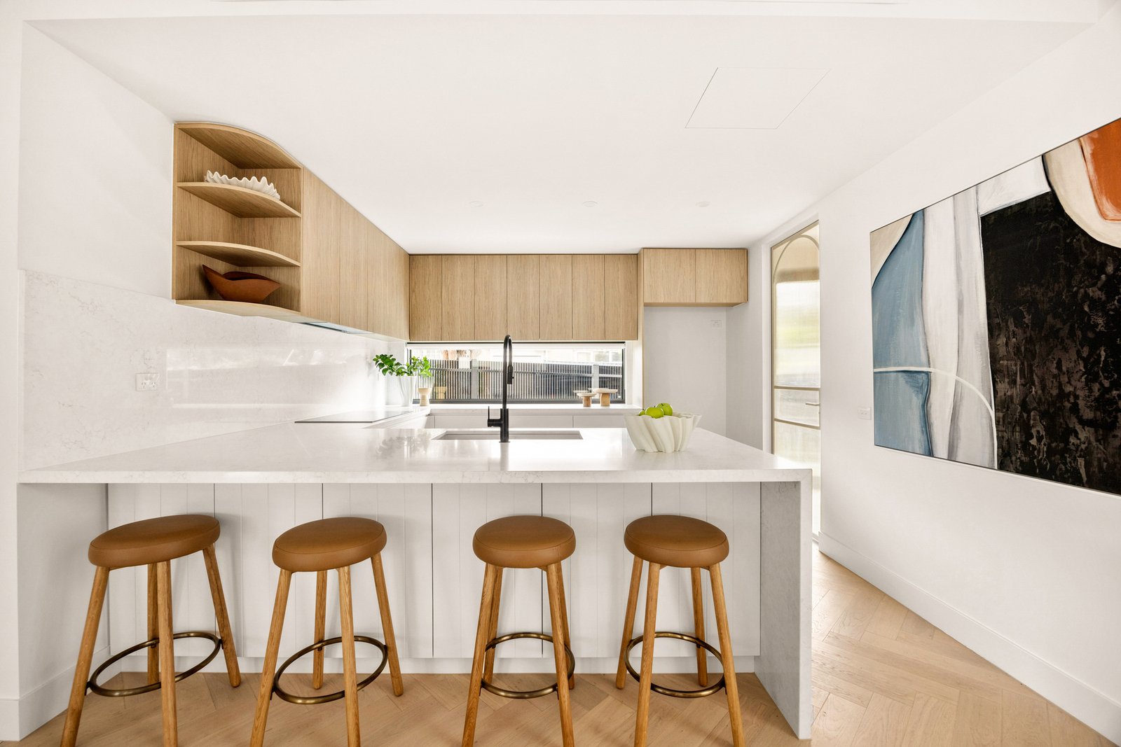 The kitchen is a standout, offering stone benchtops, a waterfall-edge peninsula island, stone splashback, and high-end appliances, including an induction cooktop, gas stove, double undermount sink, and fully integrated dishwasher. The adjacent butler’s pantry extends the kitchen’s functionality, featuring an additional sink, gas stove, and a second fully integrated dishwasher. Perfect for larger families or multi-generational living.