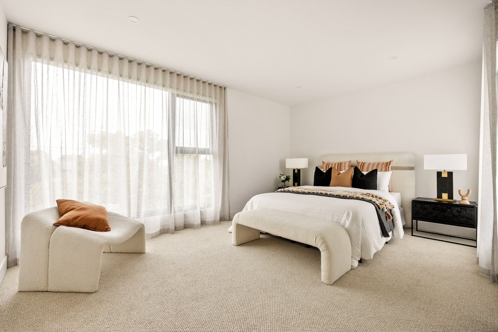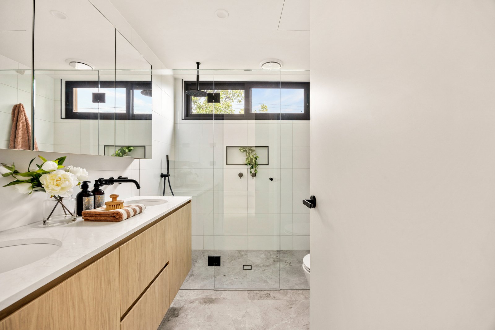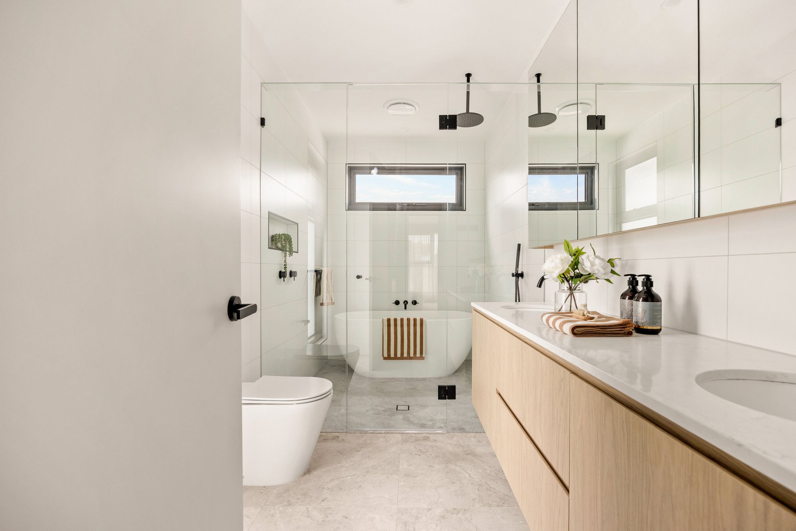 Accommodation comprises four spacious bedrooms, including a master suite downstairs with a walk-in robe and ensuite, and a second master upstairs with a walk-in robe and ensuite. Both master bathrooms feature double vanities, stone benchtops and sleek black tapware. The upstairs master also offers a freestanding bathtub, adding a touch of luxury. Two further upstairs bedrooms are equipped with built-in robes, and the plush carpeted flooring ensures warmth and comfort.
