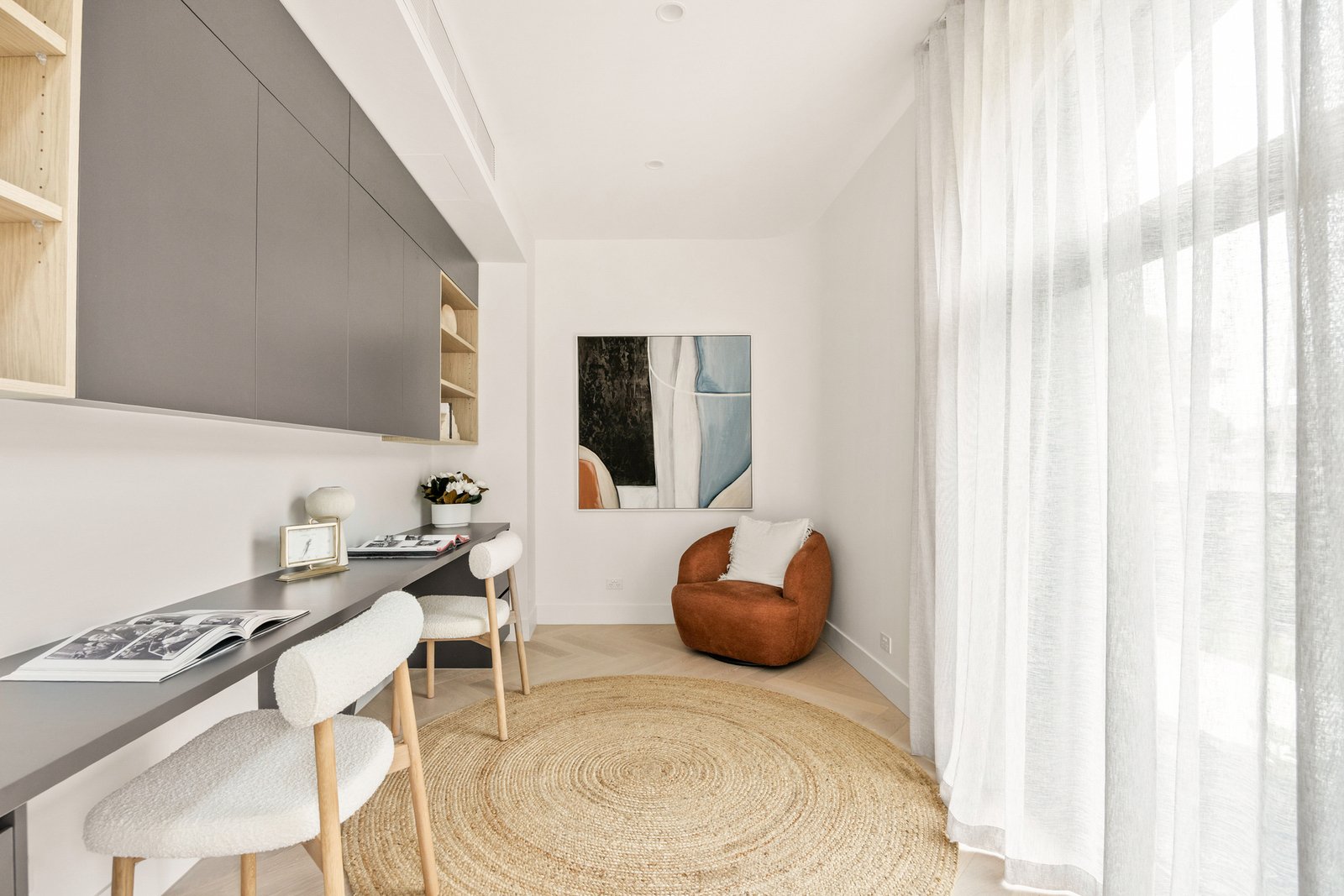 The home boasts three bathrooms, all featuring floor-to-ceiling tiles, frameless showers, rain showerheads, and stylish black tapware. The centralised main bathroom offers a single stone vanity, while a separate WC downstairs adds convenience. A dedicated home office, mudroom, and fully fitted laundry further enhance the home’s practical layout.