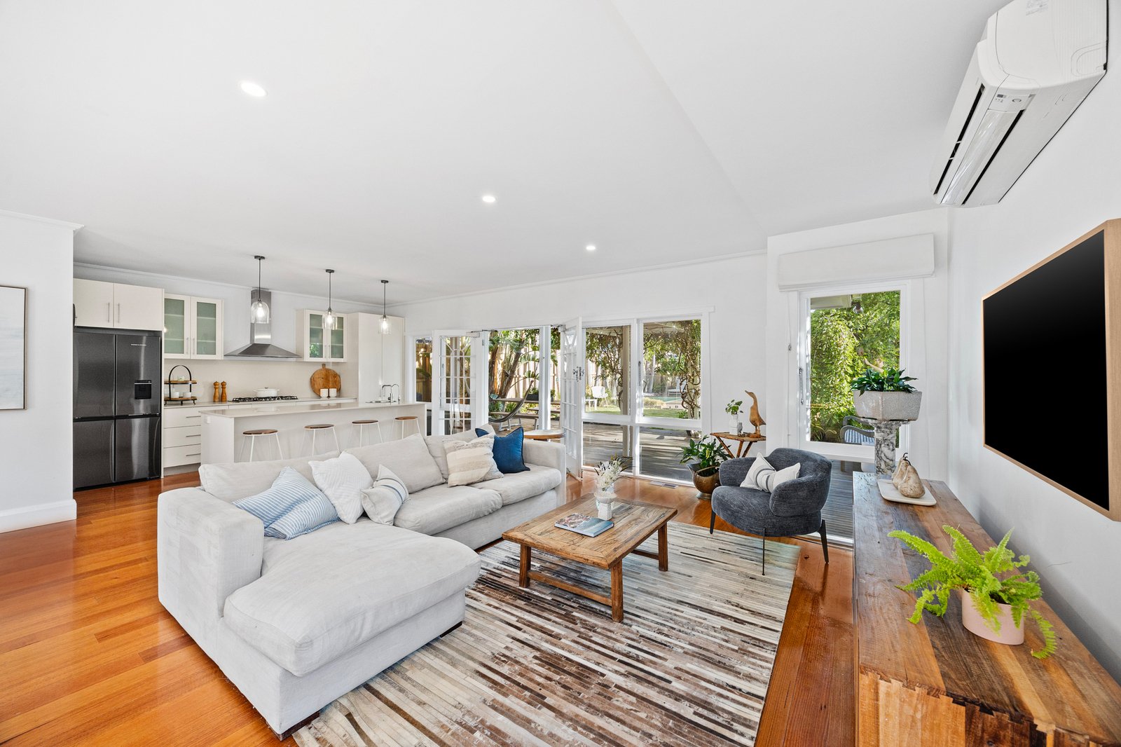 Beyond, sun-filled open-plan living and dining sit alongside a beautifully appointed kitchen featuring Bosch appliances, Miele dishwasher, stone benchtops, breakfast island and abundant cabinetry.